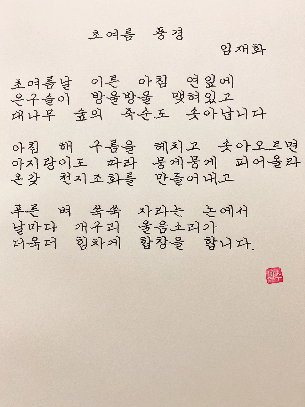 평범한 직장인. 사내 동호회를 통해 매일 한편 손으로 시 읽기를 시작한 이후로, 매일 시 한편을 필사 합니다. 필사한 시가 저작권에 문제가 된다면 말씀해주세요.