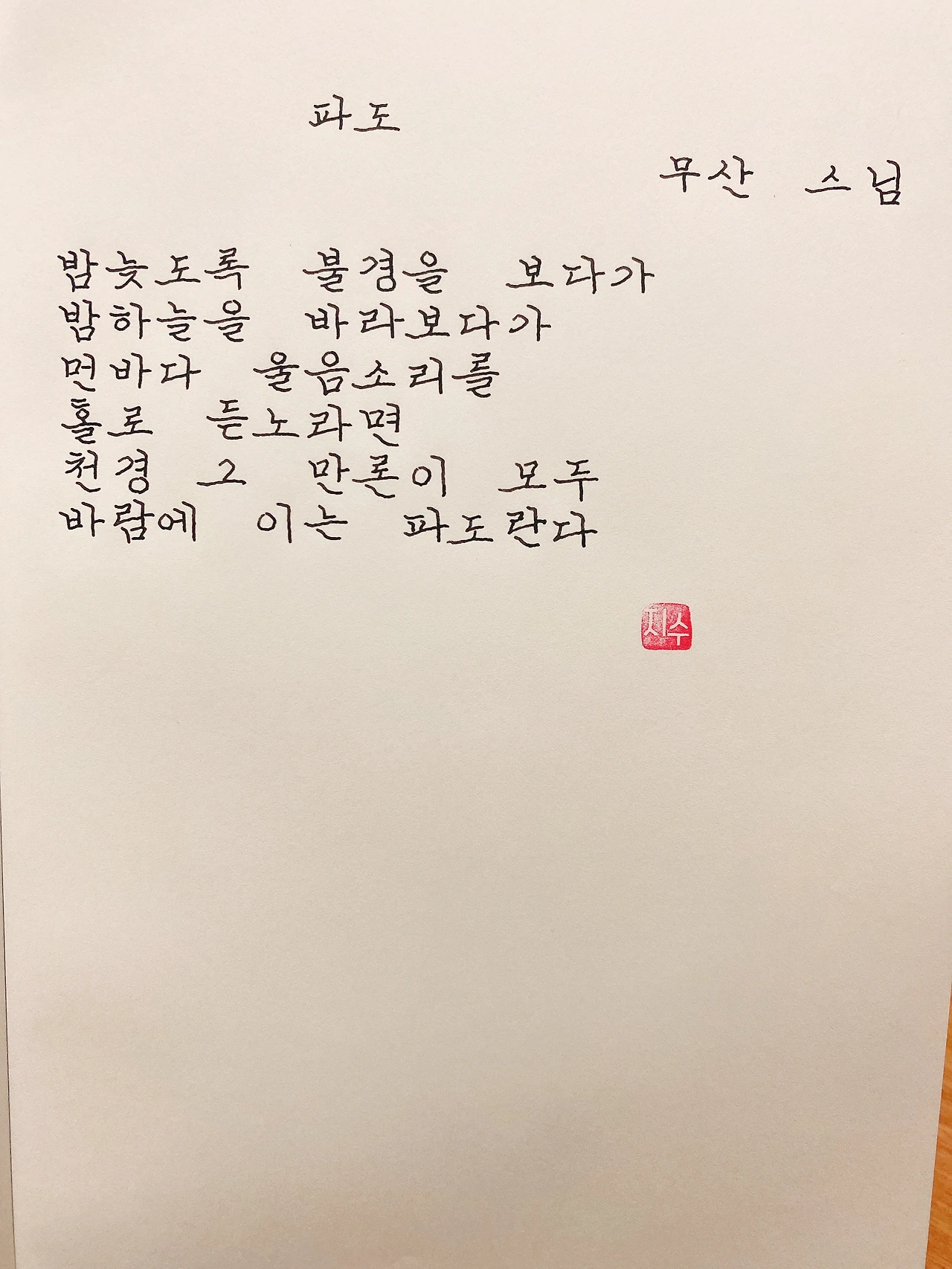 평범한 직장인. 사내 동호회를 통해 매일 한편 손으로 시 읽기를 시작한 이후로, 매일 시 한편을 필사 합니다. 필사한 시가 저작권에 문제가 된다면 말씀해주세요.