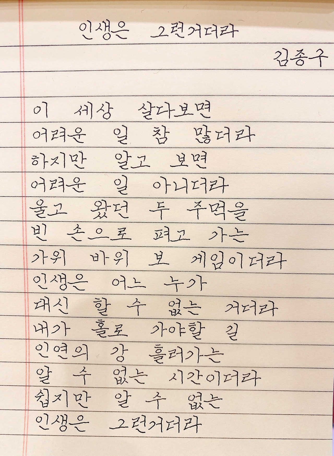 평범한 직장인. 사내 동호회를 통해 매일 한편 손으로 시 읽기를 시작한 이후로, 매일 시 한편을 필사 합니다. 필사한 시가 저작권에 문제가 된다면 말씀해주세요.