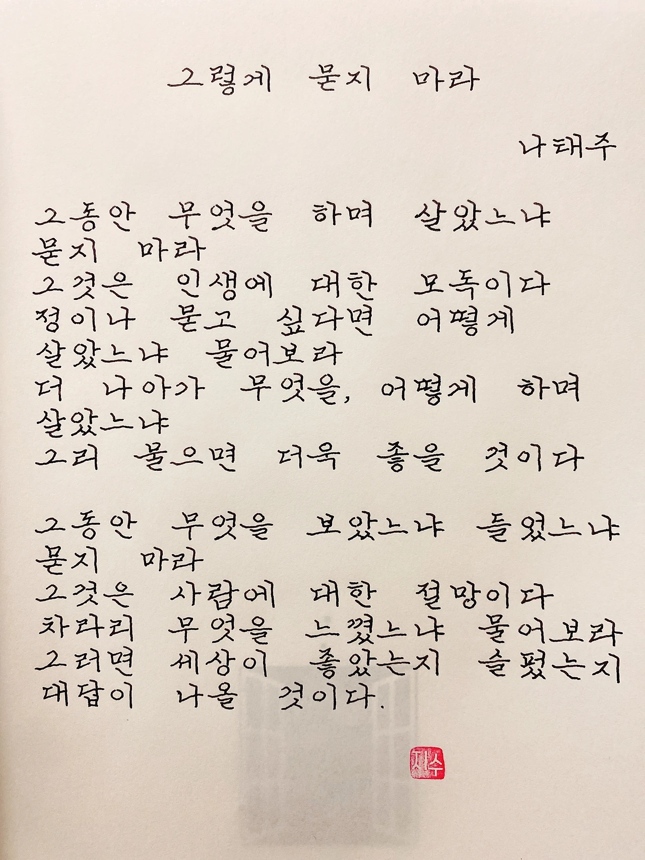 평범한 직장인. 사내 동호회를 통해 매일 한편 손으로 시 읽기를 시작한 이후로, 매일 시 한편을 필사 합니다. 필사한 시가 저작권에 문제가 된다면 말씀해주세요.