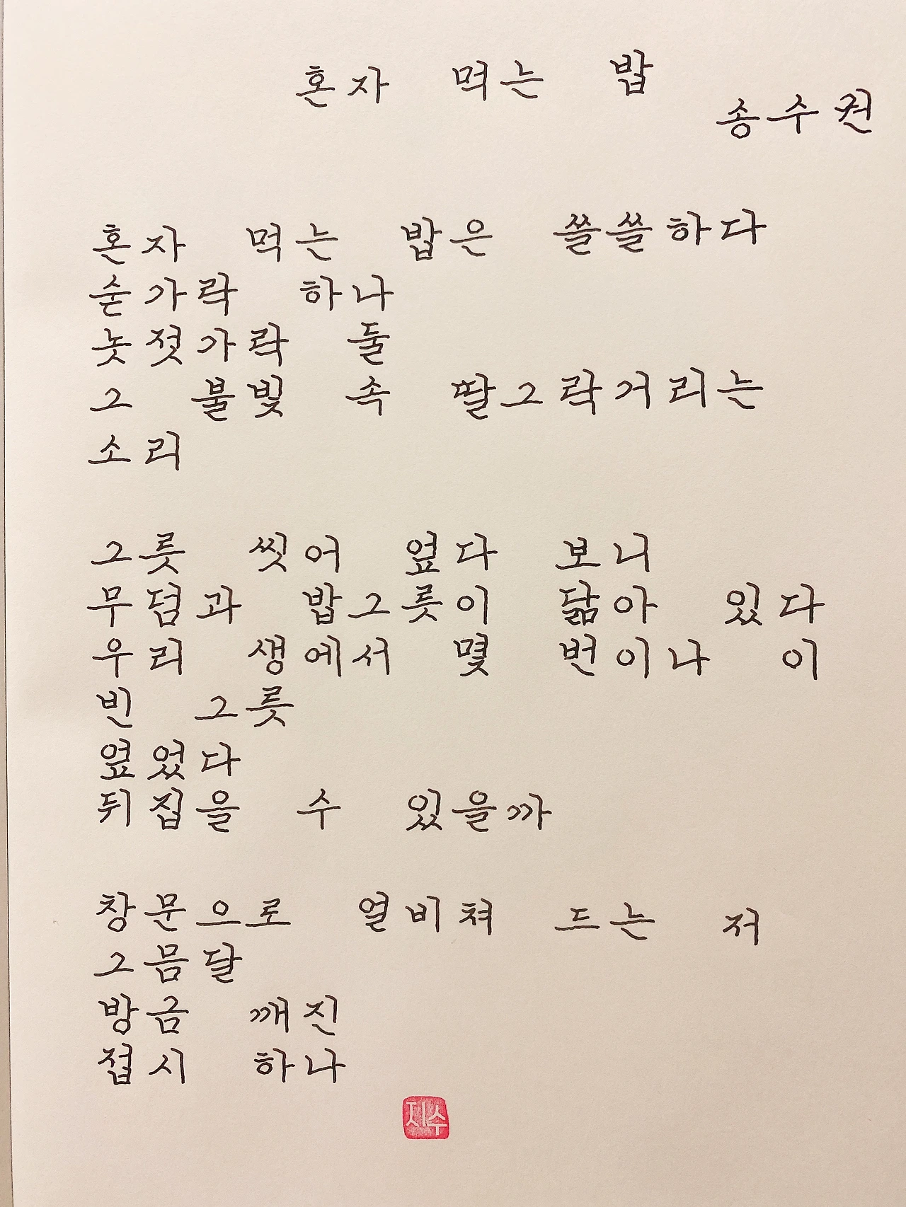 평범한 직장인. 사내 동호회를 통해 매일 한편 손으로 시 읽기를 시작한 이후로, 매일 시 한편을 필사 합니다. 필사한 시가 저작권에 문제가 된다면 말씀해주세요.
