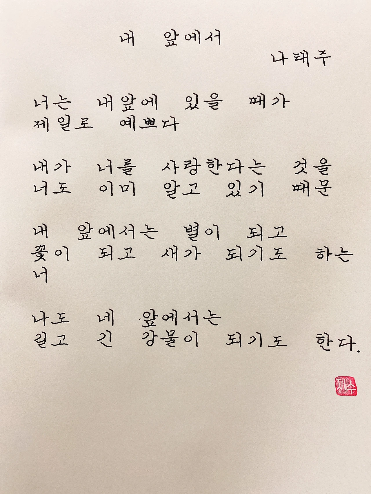 평범한 직장인. 사내 동호회를 통해 매일 한편 손으로 시 읽기를 시작한 이후로, 매일 시 한편을 필사 합니다. 필사한 시가 저작권에 문제가 된다면 말씀해주세요.