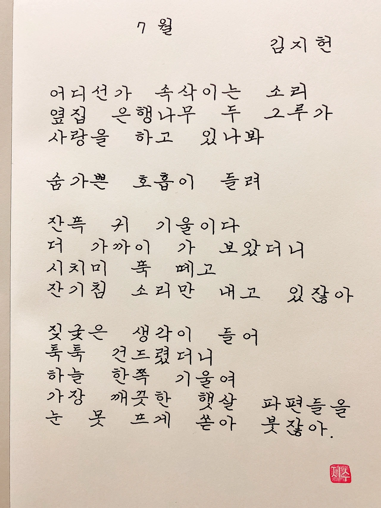 평범한 직장인. 사내 동호회를 통해 매일 한편 손으로 시 읽기를 시작한 이후로, 매일 시 한편을 필사 합니다. 필사한 시가 저작권에 문제가 된다면 말씀해주세요.