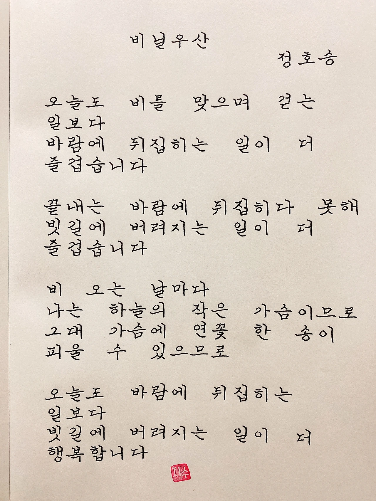 평범한 직장인. 사내 동호회를 통해 매일 한편 손으로 시 읽기를 시작한 이후로, 매일 시 한편을 필사 합니다. 필사한 시가 저작권에 문제가 된다면 말씀해주세요.