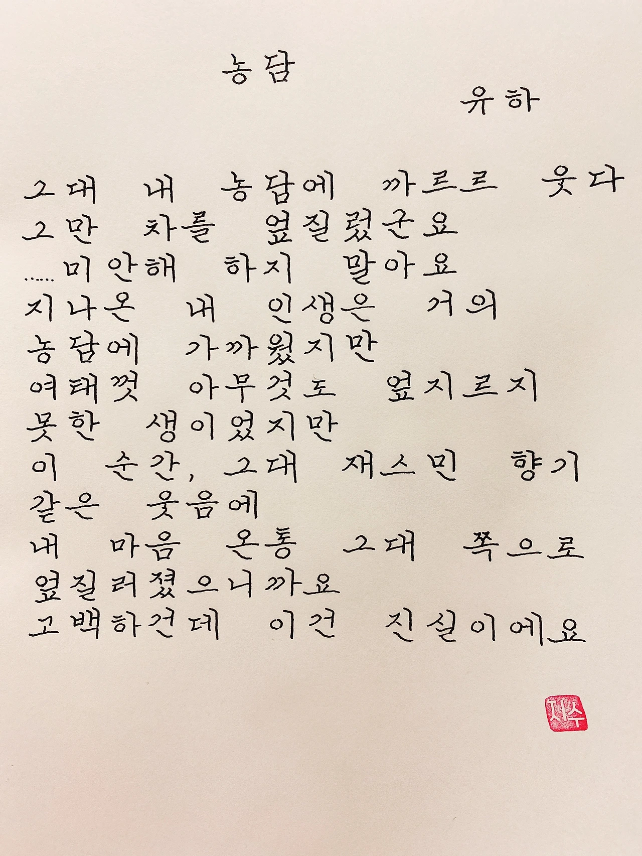 평범한 직장인. 사내 동호회를 통해 매일 한편 손으로 시 읽기를 시작한 이후로, 매일 시 한편을 필사 합니다. 필사한 시가 저작권에 문제가 된다면 말씀해주세요.