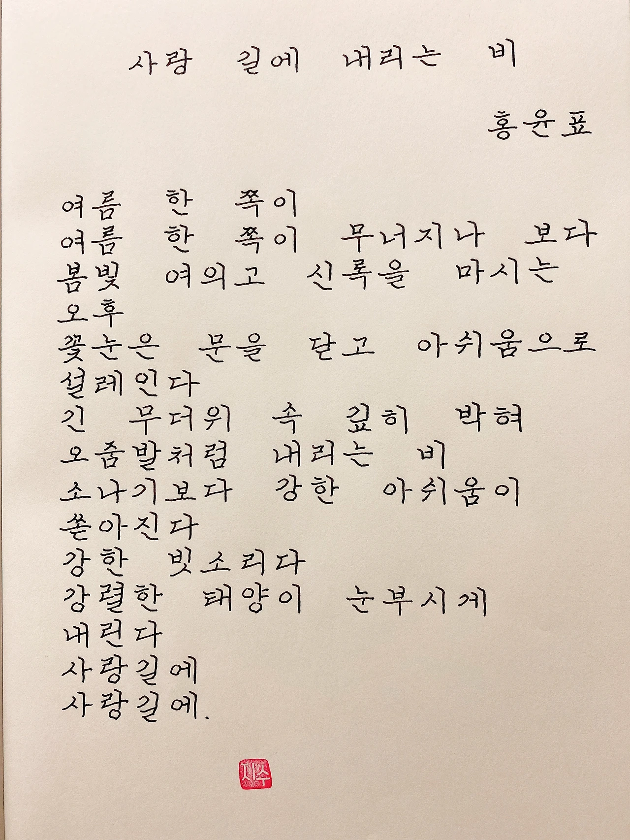 평범한 직장인. 사내 동호회를 통해 매일 한편 손으로 시 읽기를 시작한 이후로, 매일 시 한편을 필사 합니다. 필사한 시가 저작권에 문제가 된다면 말씀해주세요.