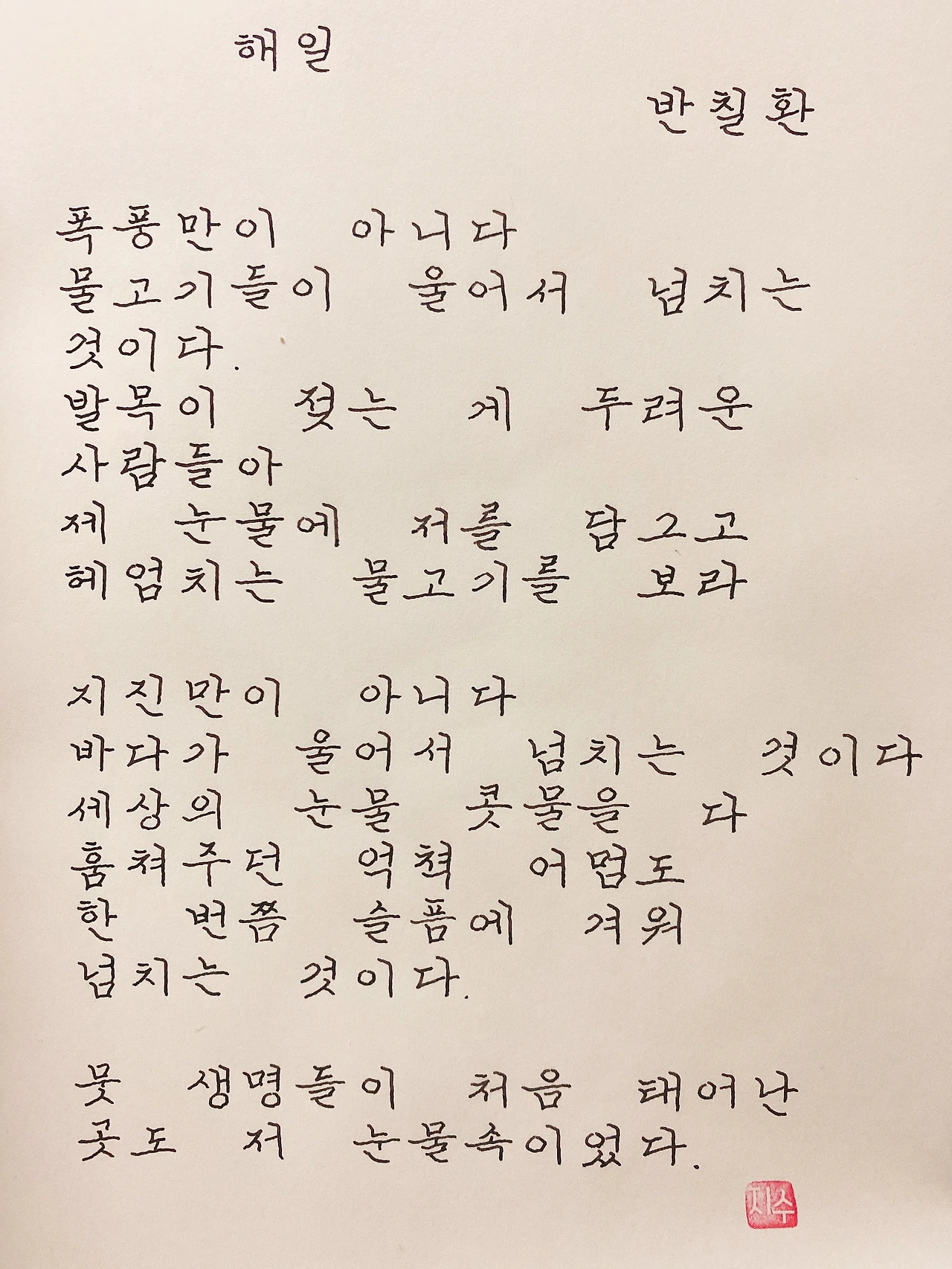 평범한 직장인. 사내 동호회를 통해 매일 한편 손으로 시 읽기를 시작한 이후로, 매일 시 한편을 필사 합니다. 필사한 시가 저작권에 문제가 된다면 말씀해주세요.