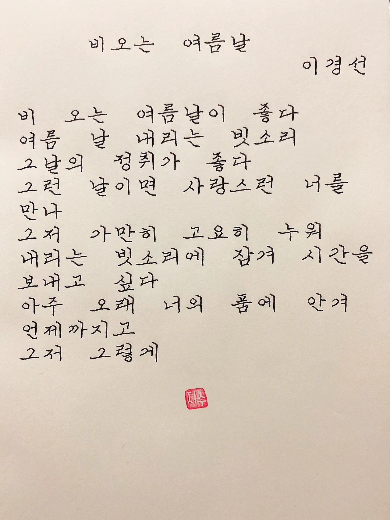 평범한 직장인. 사내 동호회를 통해 매일 한편 손으로 시 읽기를 시작한 이후로, 매일 시 한편을 필사 합니다. 필사한 시가 저작권에 문제가 된다면 말씀해주세요.