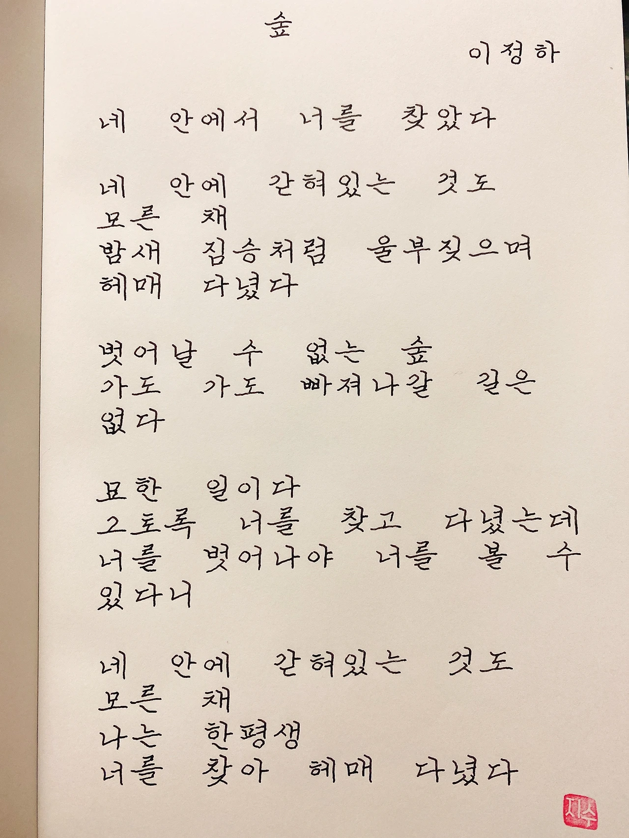 평범한 직장인. 사내 동호회를 통해 매일 한편 손으로 시 읽기를 시작한 이후로, 매일 시 한편을 필사 합니다. 필사한 시가 저작권에 문제가 된다면 말씀해주세요.