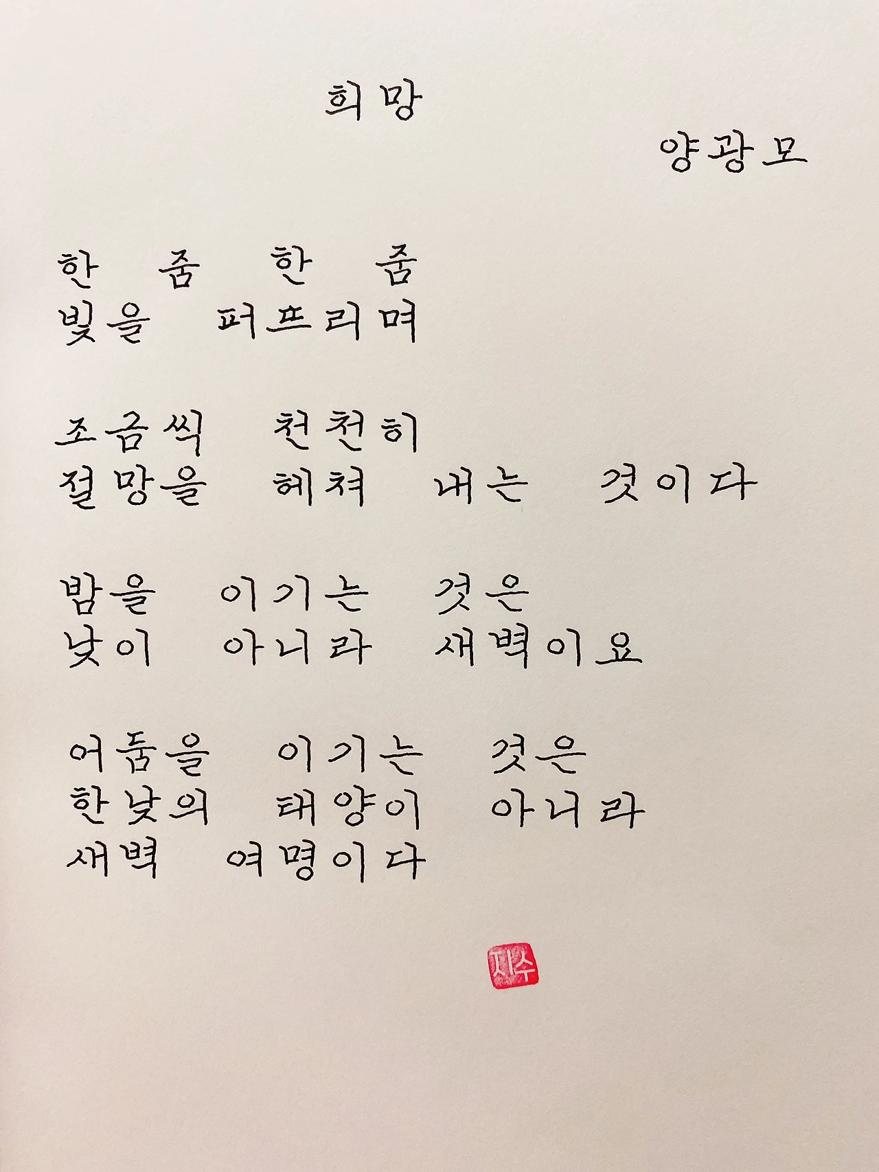 평범한 직장인. 사내 동호회를 통해 매일 한편 손으로 시 읽기를 시작한 이후로, 매일 시 한편을 필사 합니다. 필사한 시가 저작권에 문제가 된다면 말씀해주세요.