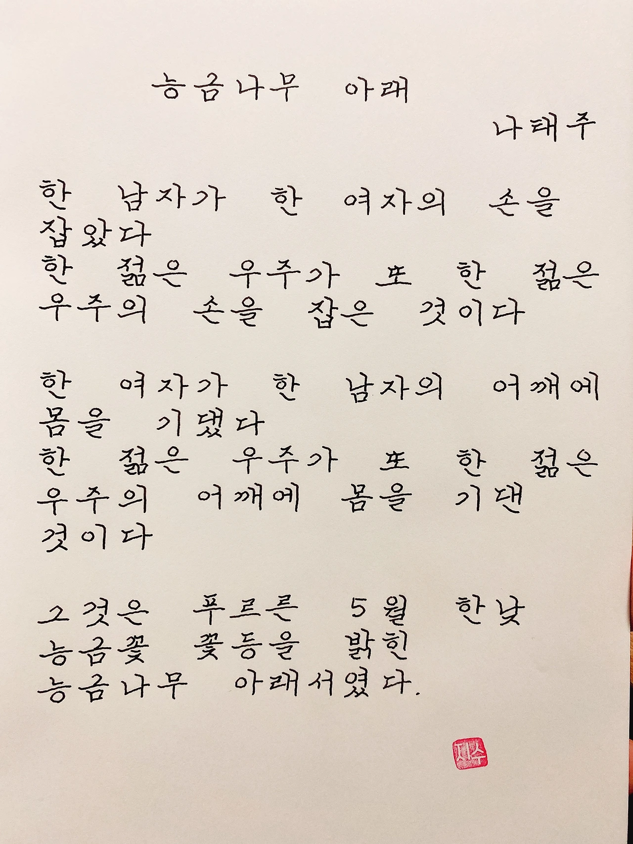 평범한 직장인. 사내 동호회를 통해 매일 한편 손으로 시 읽기를 시작한 이후로, 매일 시 한편을 필사 합니다. 필사한 시가 저작권에 문제가 된다면 말씀해주세요.