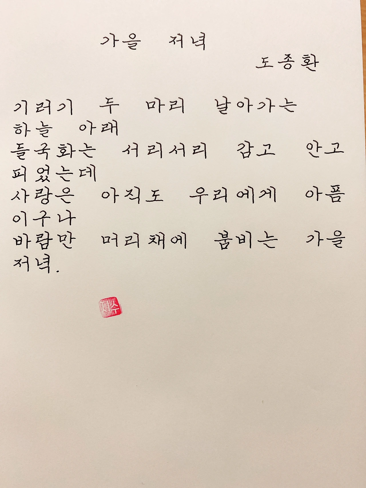 평범한 직장인. 사내 동호회를 통해 매일 한편 손으로 시 읽기를 시작한 이후로, 매일 시 한편을 필사 합니다. 필사한 시가 저작권에 문제가 된다면 말씀해주세요.