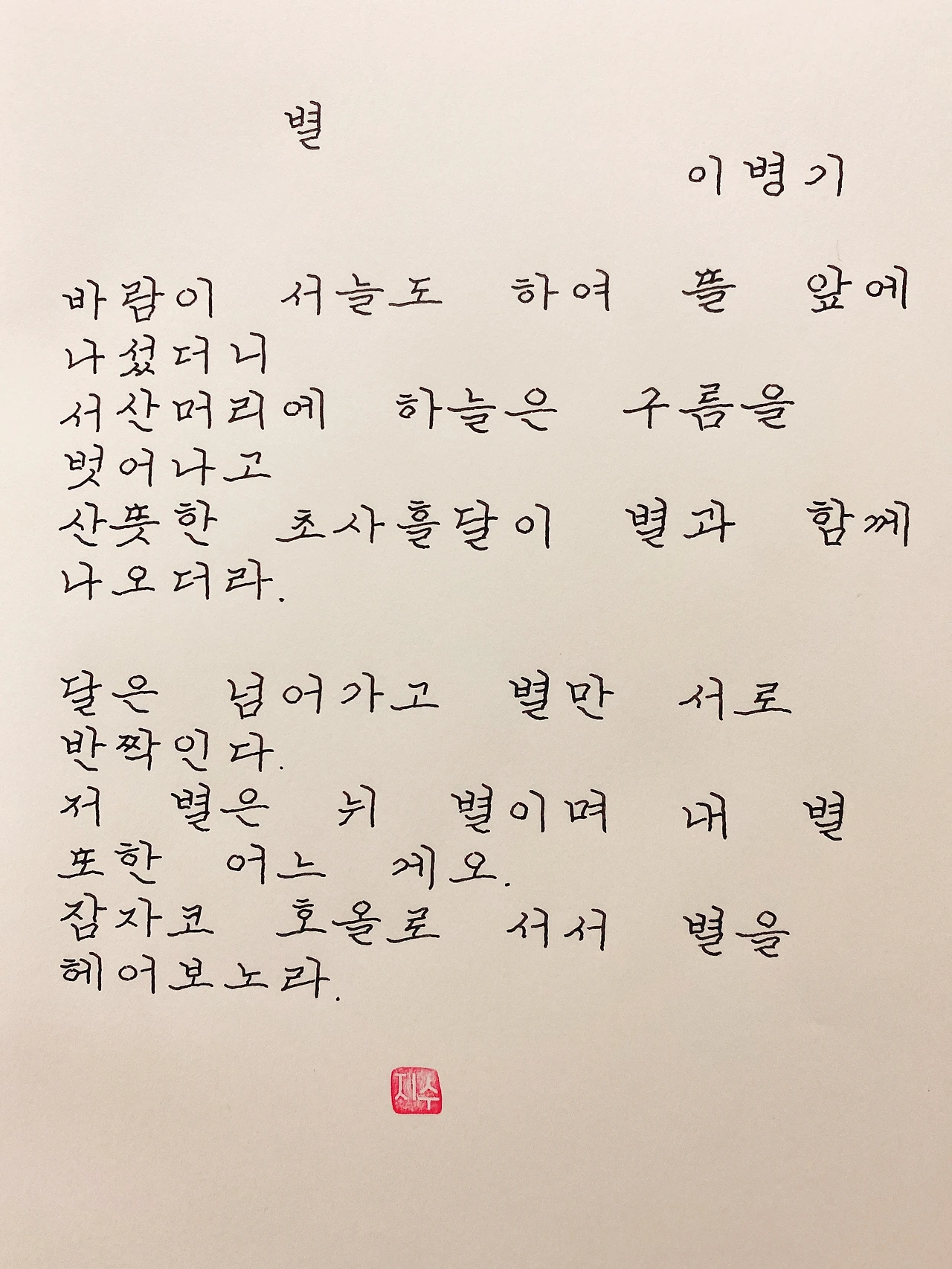 평범한 직장인. 사내 동호회를 통해 매일 한편 손으로 시 읽기를 시작한 이후로, 매일 시 한편을 필사 합니다. 필사한 시가 저작권에 문제가 된다면 말씀해주세요.