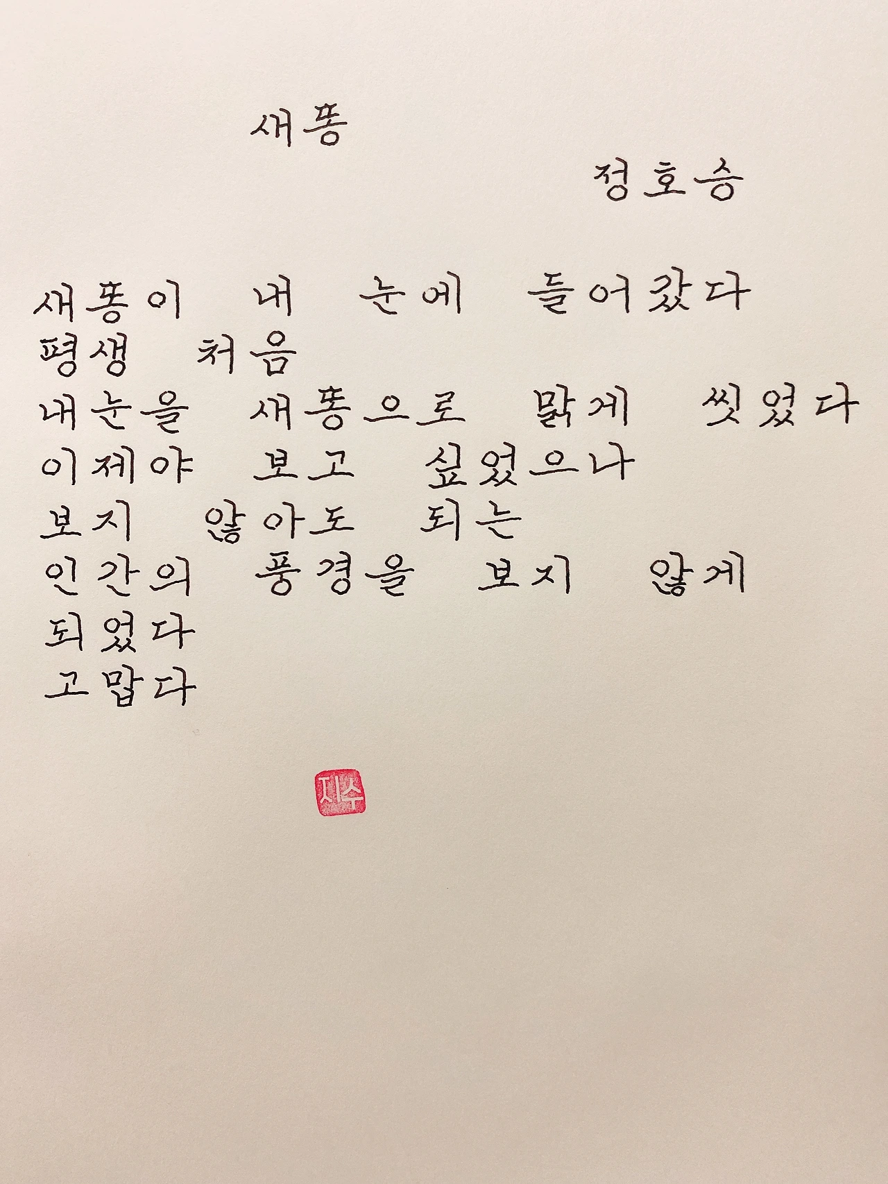 평범한 직장인. 사내 동호회를 통해 매일 한편 손으로 시 읽기를 시작한 이후로, 매일 시 한편을 필사 합니다. 필사한 시가 저작권에 문제가 된다면 말씀해주세요.