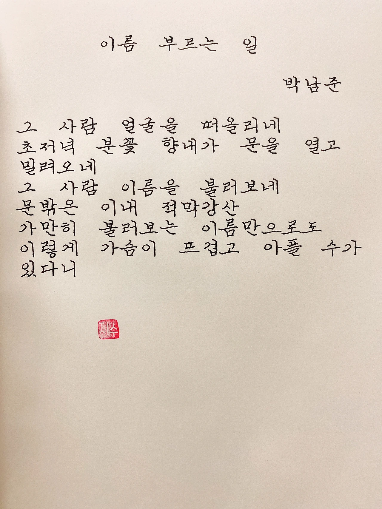 평범한 직장인. 사내 동호회를 통해 매일 한편 손으로 시 읽기를 시작한 이후로, 매일 시 한편을 필사 합니다. 필사한 시가 저작권에 문제가 된다면 말씀해주세요.