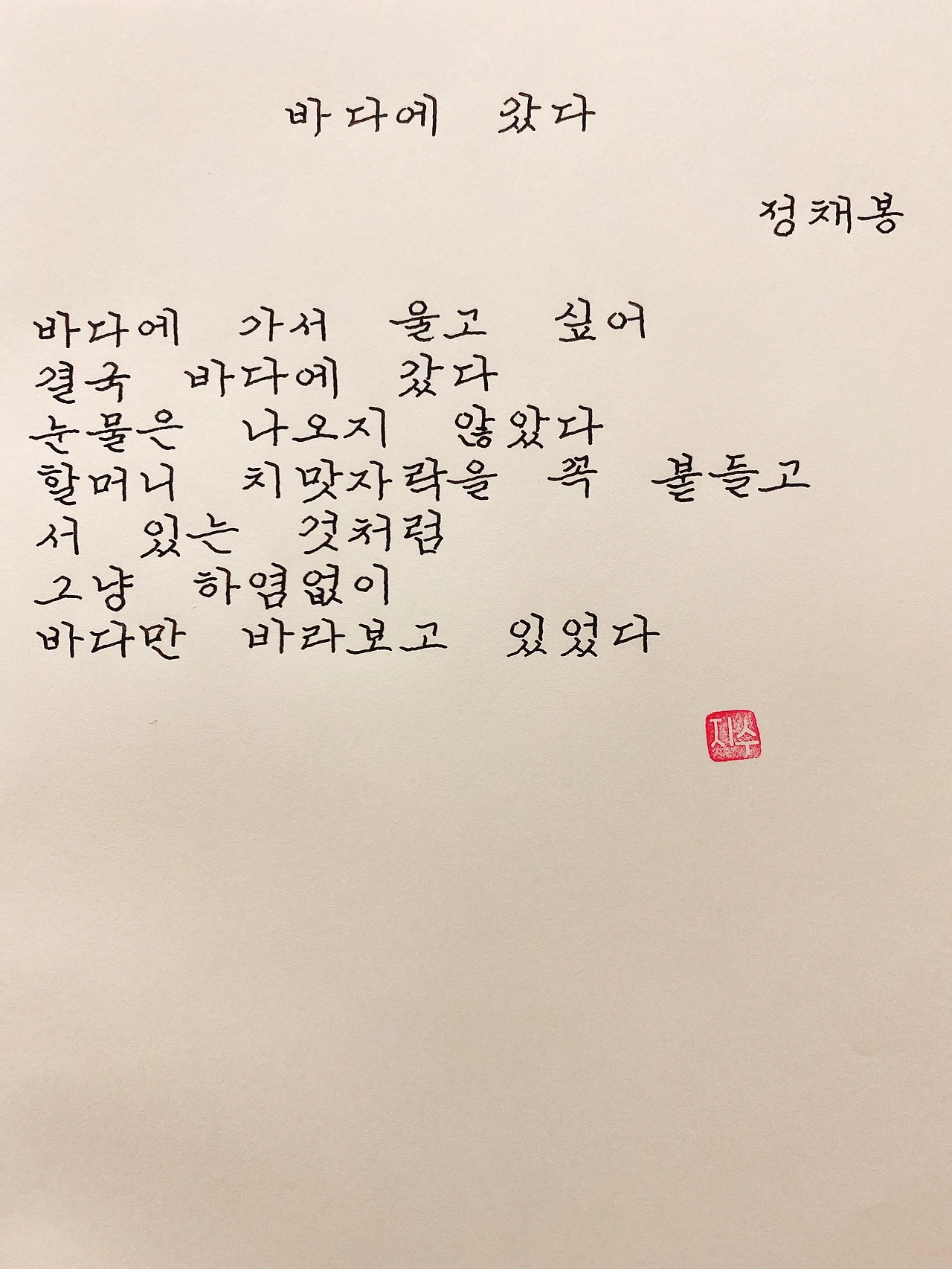 평범한 직장인. 사내 동호회를 통해 매일 한편 손으로 시 읽기를 시작한 이후로, 매일 시 한편을 필사 합니다. 필사한 시가 저작권에 문제가 된다면 말씀해주세요.