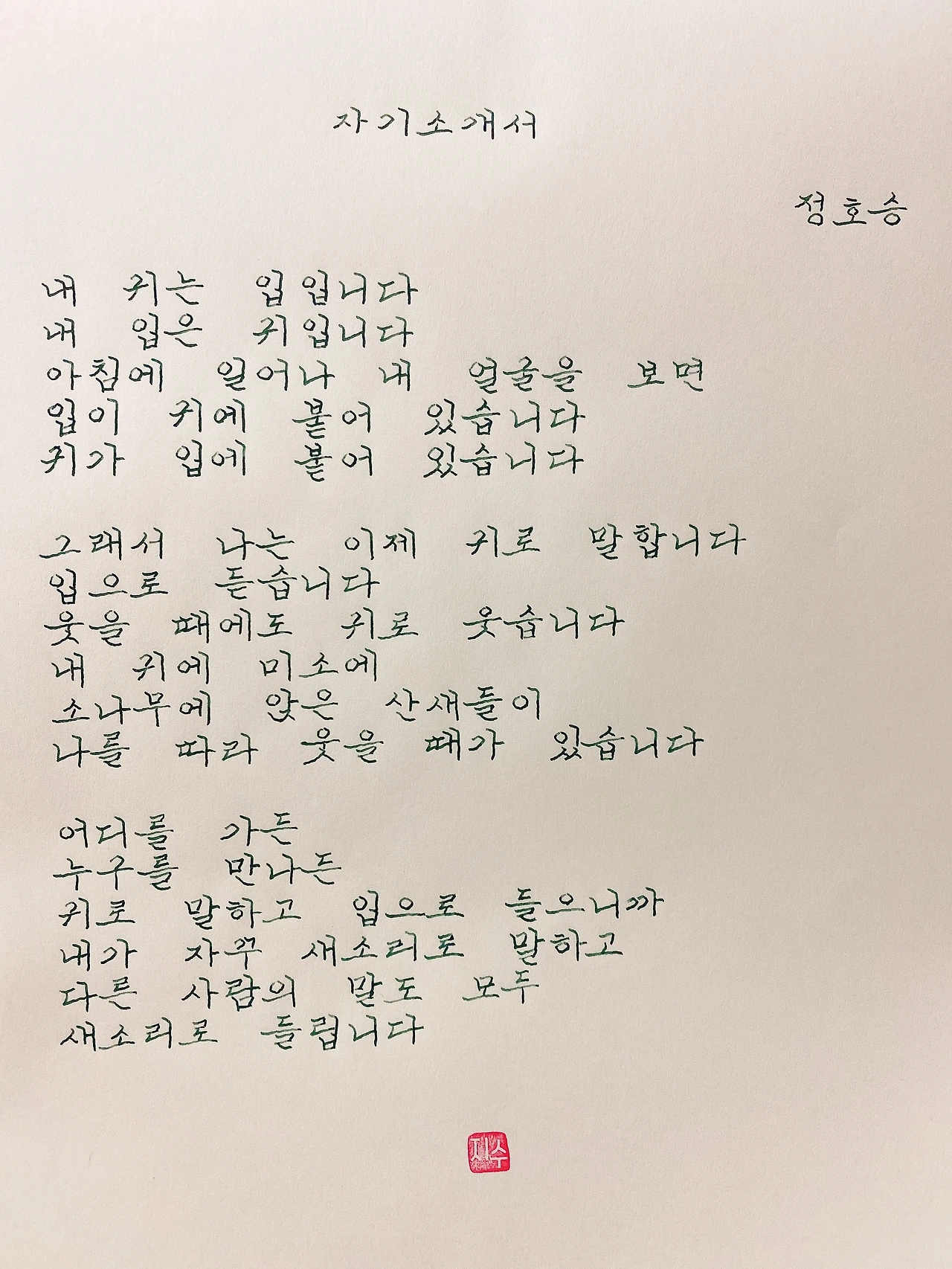 평범한 직장인. 사내 동호회를 통해 매일 한편 손으로 시 읽기를 시작한 이후로, 매일 시 한편을 필사 합니다. 필사한 시가 저작권에 문제가 된다면 말씀해주세요.