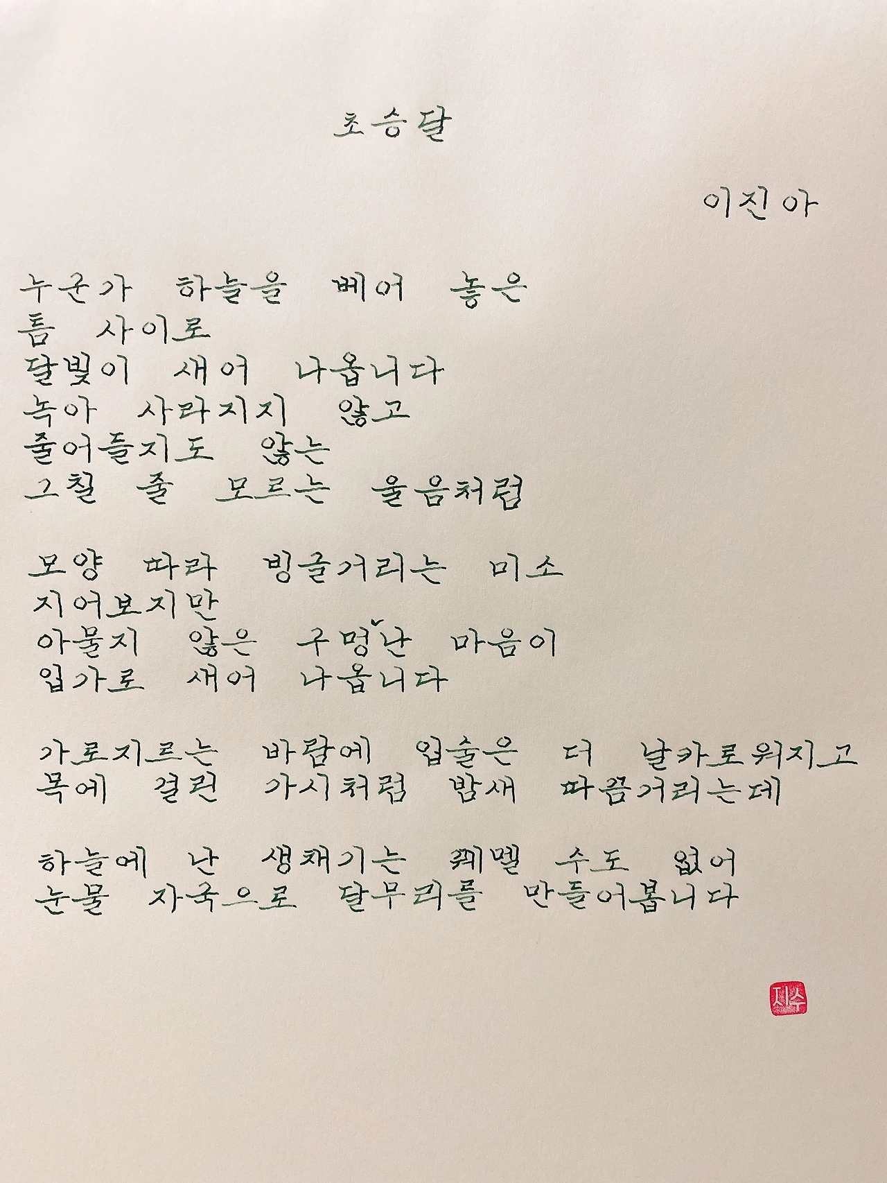 평범한 직장인. 사내 동호회를 통해 매일 한편 손으로 시 읽기를 시작한 이후로, 매일 시 한편을 필사 합니다. 필사한 시가 저작권에 문제가 된다면 말씀해주세요.