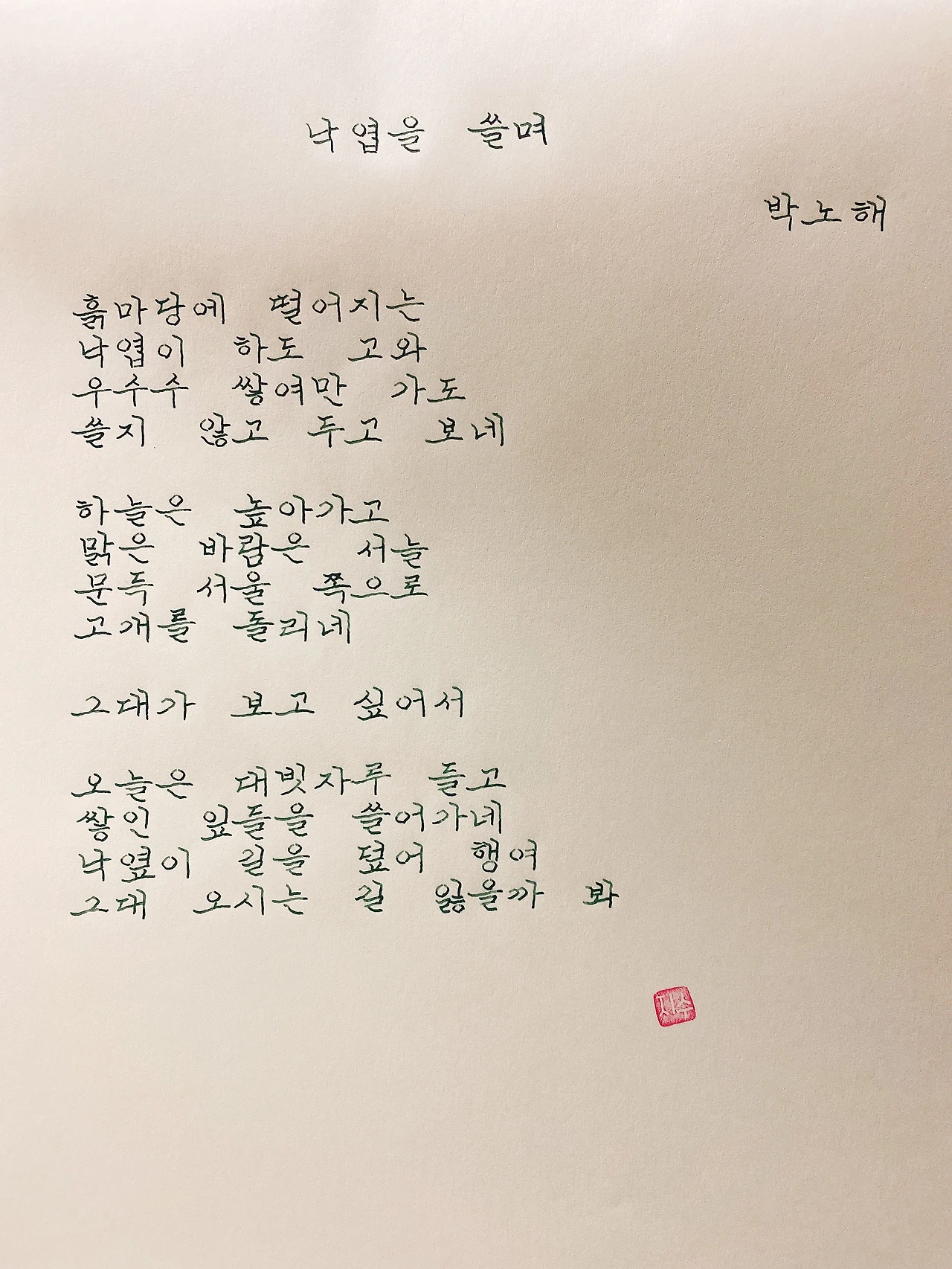 평범한 직장인. 사내 동호회를 통해 매일 한편 손으로 시 읽기를 시작한 이후로, 매일 시 한편을 필사 합니다. 필사한 시가 저작권에 문제가 된다면 말씀해주세요.