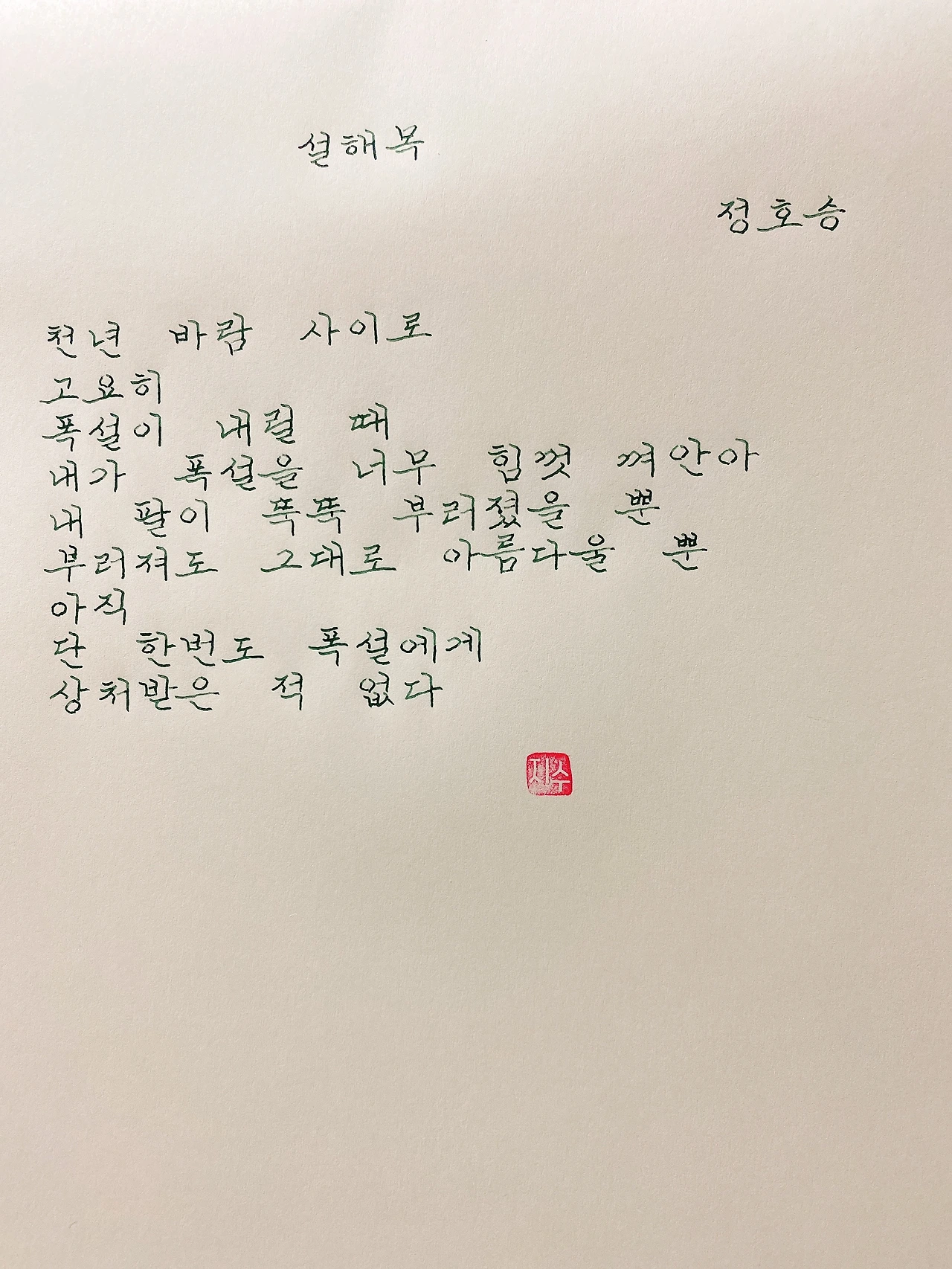 평범한 직장인. 사내 동호회를 통해 매일 한편 손으로 시 읽기를 시작한 이후로, 매일 시 한편을 필사 합니다. 필사한 시가 저작권에 문제가 된다면 말씀해주세요.