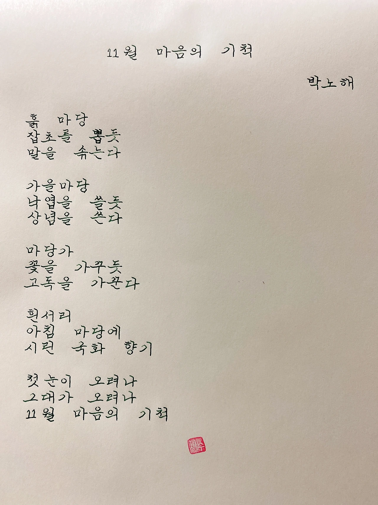 평범한 직장인. 사내 동호회를 통해 매일 한편 손으로 시 읽기를 시작한 이후로, 매일 시 한편을 필사 합니다. 필사한 시가 저작권에 문제가 된다면 말씀해주세요.