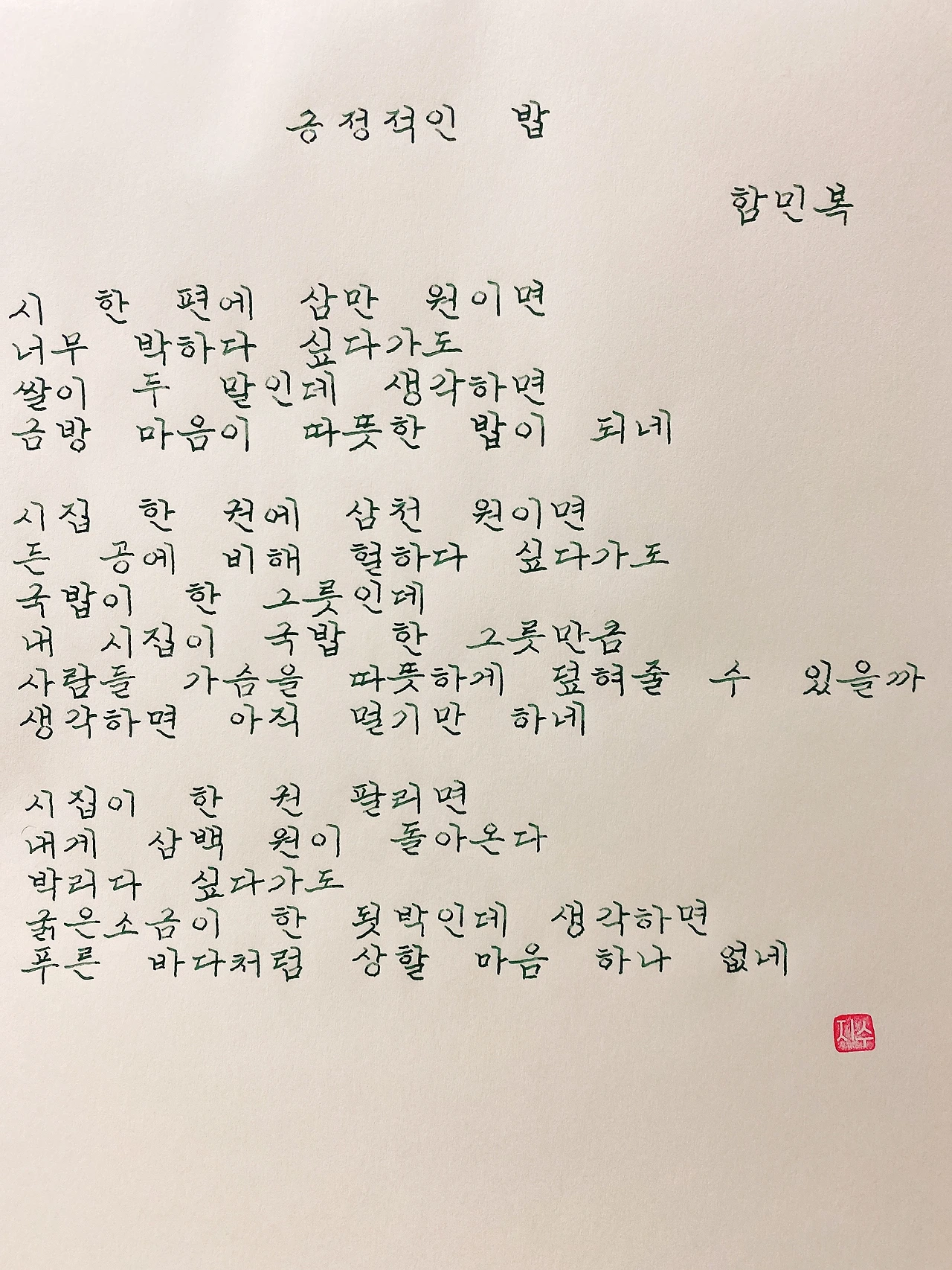 평범한 직장인. 사내 동호회를 통해 매일 한편 손으로 시 읽기를 시작한 이후로, 매일 시 한편을 필사 합니다. 필사한 시가 저작권에 문제가 된다면 말씀해주세요.