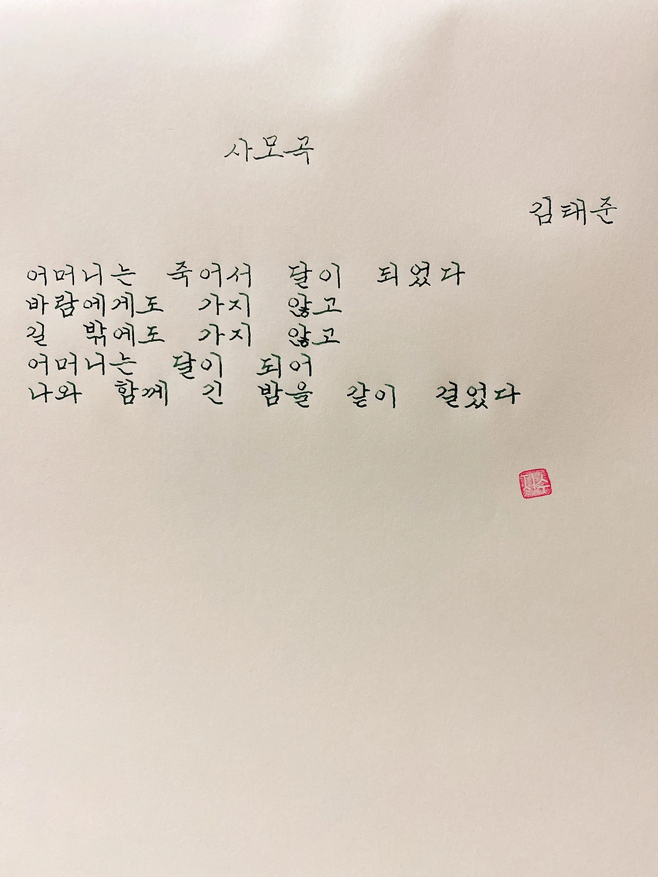평범한 직장인. 사내 동호회를 통해 매일 한편 손으로 시 읽기를 시작한 이후로, 매일 시 한편을 필사 합니다. 필사한 시가 저작권에 문제가 된다면 말씀해주세요.