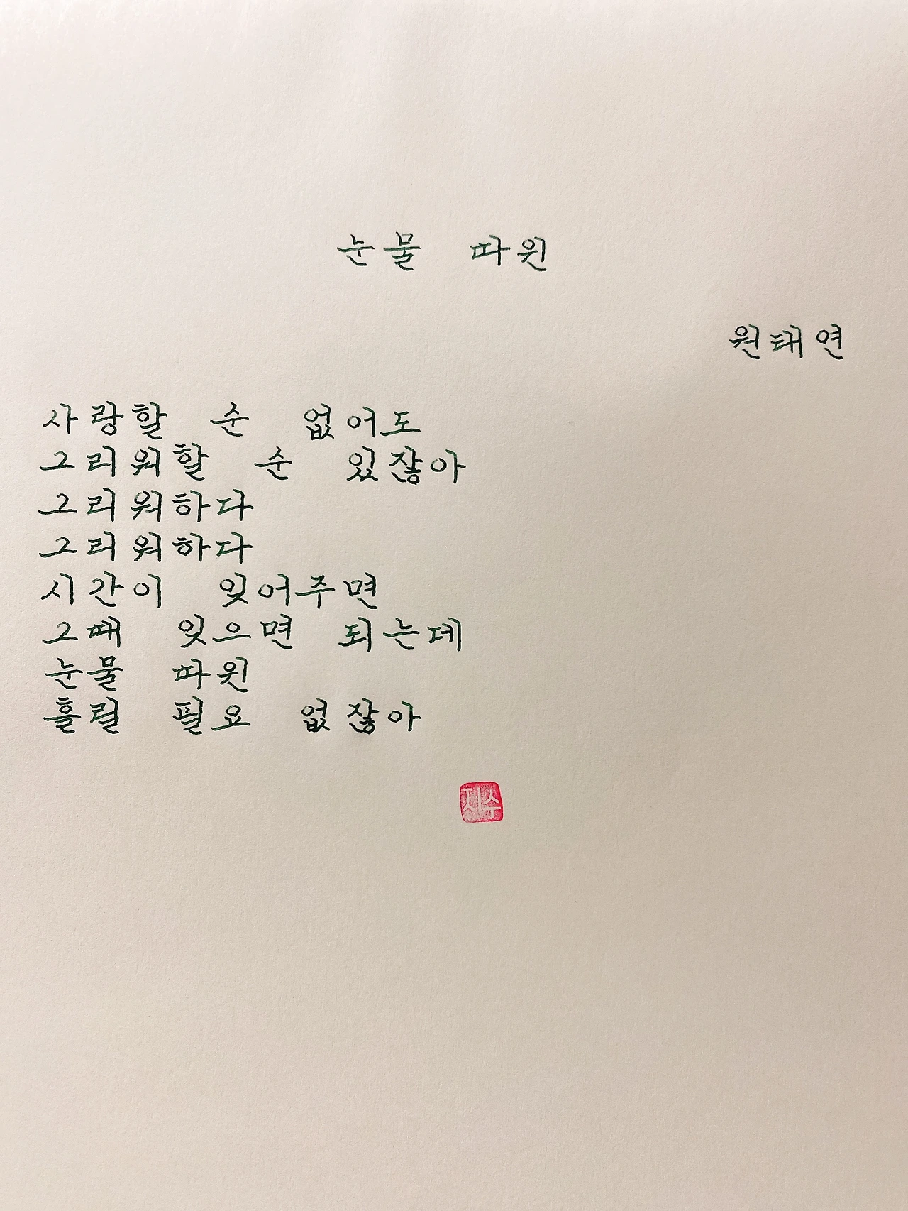 평범한 직장인. 사내 동호회를 통해 매일 한편 손으로 시 읽기를 시작한 이후로, 매일 시 한편을 필사 합니다. 필사한 시가 저작권에 문제가 된다면 말씀해주세요.