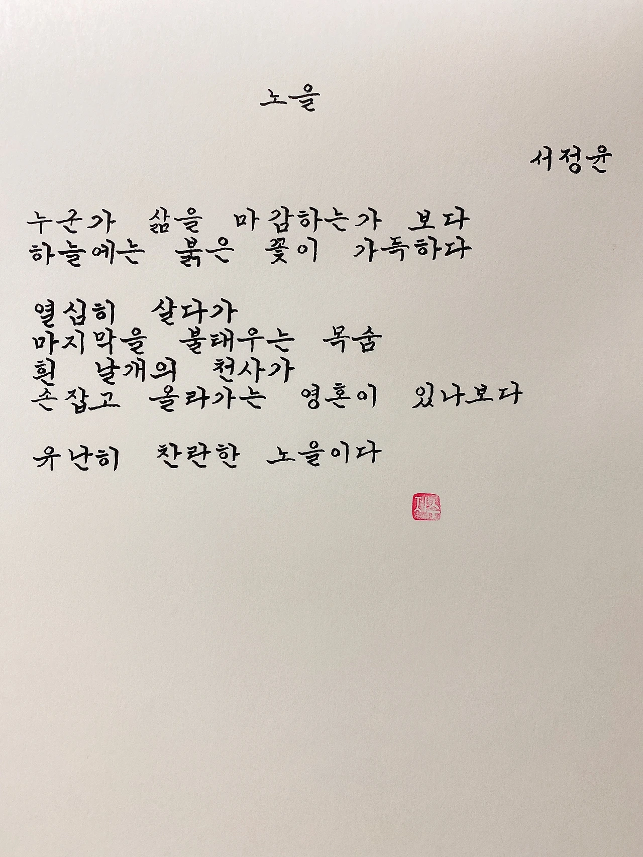 평범한 직장인. 사내 동호회를 통해 매일 한편 손으로 시 읽기를 시작한 이후로, 매일 시 한편을 필사 합니다. 필사한 시가 저작권에 문제가 된다면 말씀해주세요.