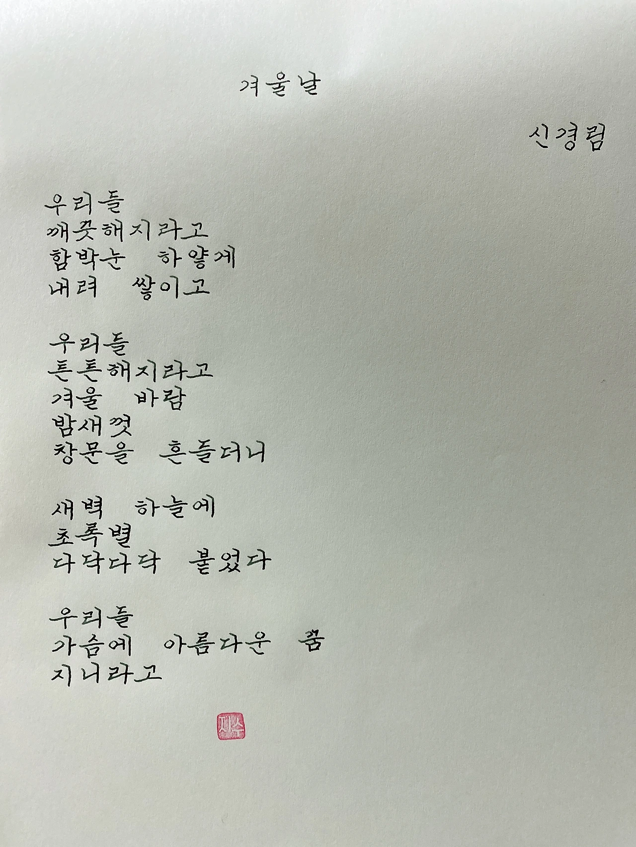 평범한 직장인. 사내 동호회를 통해 매일 한편 손으로 시 읽기를 시작한 이후로, 매일 시 한편을 필사 합니다. 필사한 시가 저작권에 문제가 된다면 말씀해주세요.