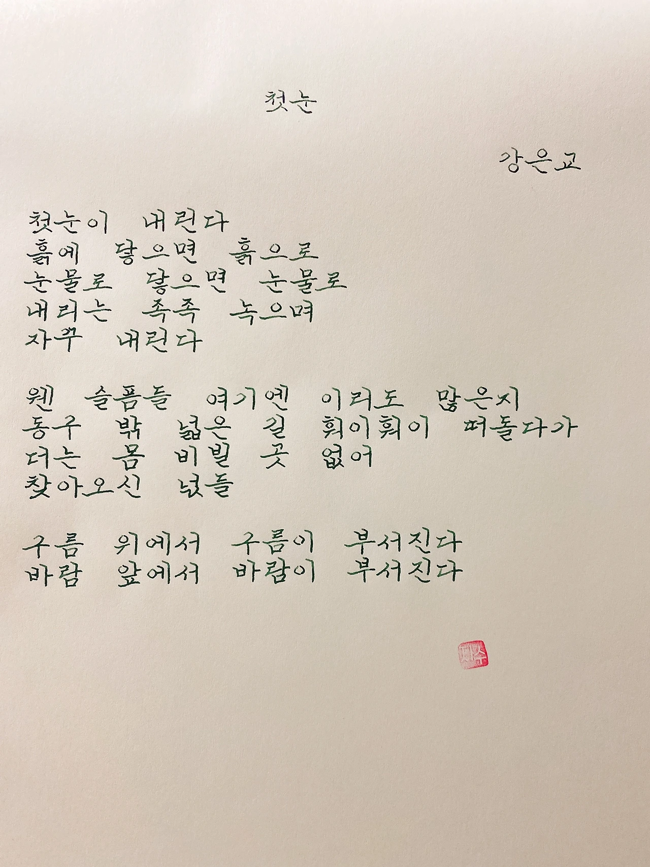 평범한 직장인. 사내 동호회를 통해 매일 한편 손으로 시 읽기를 시작한 이후로, 매일 시 한편을 필사 합니다. 필사한 시가 저작권에 문제가 된다면 말씀해주세요.