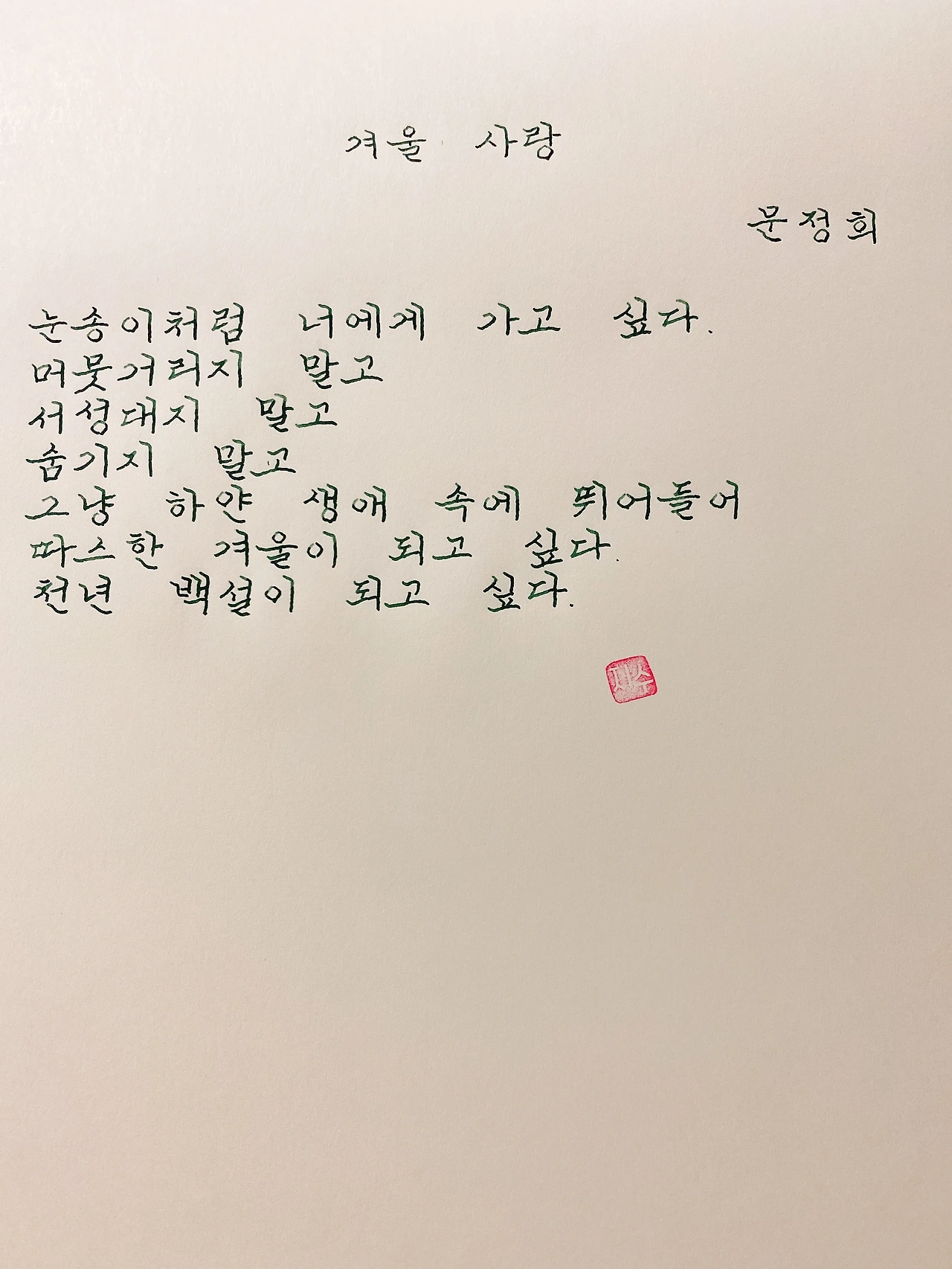 평범한 직장인. 사내 동호회를 통해 매일 한편 손으로 시 읽기를 시작한 이후로, 매일 시 한편을 필사 합니다. 필사한 시가 저작권에 문제가 된다면 말씀해주세요.