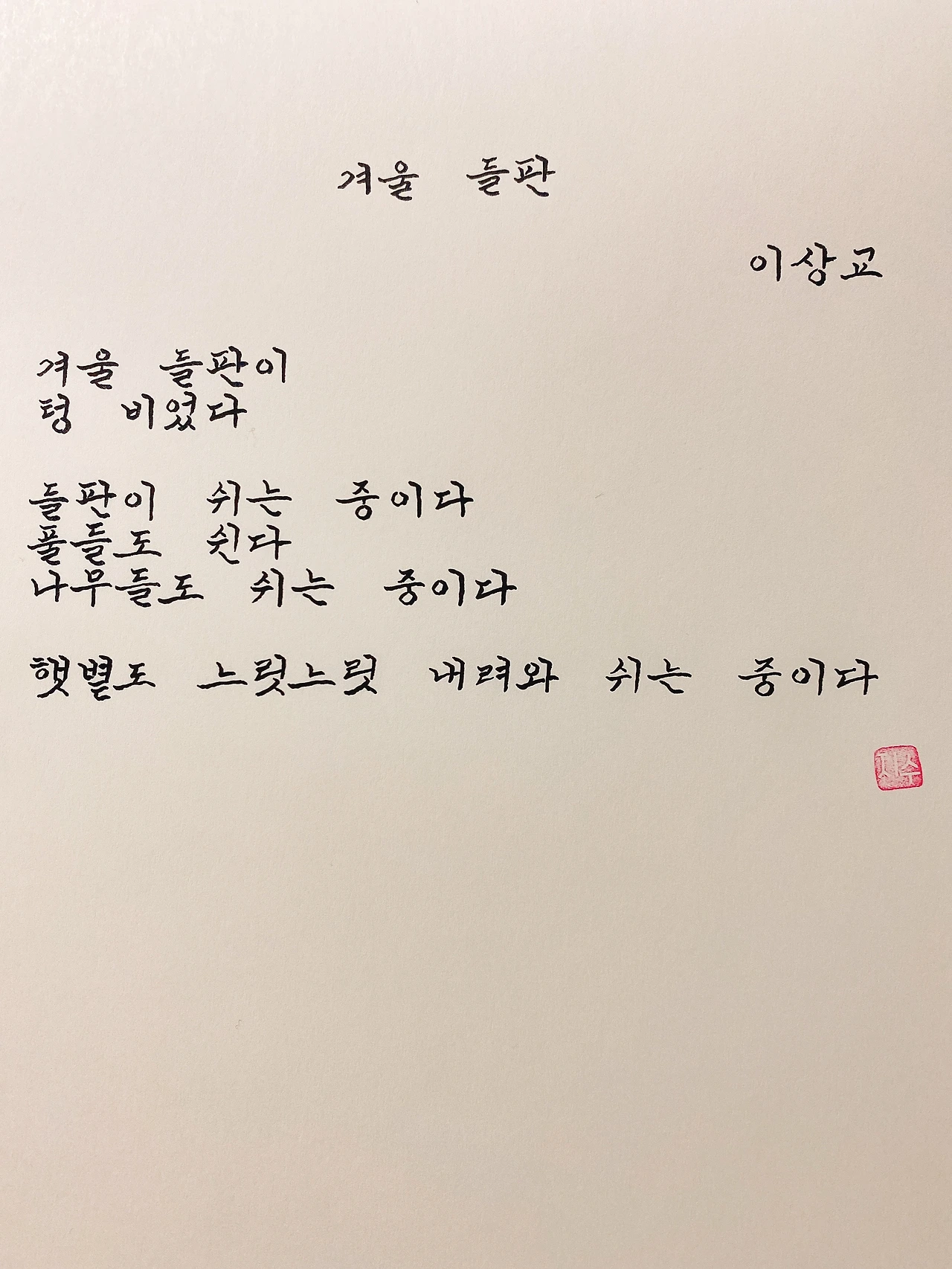 평범한 직장인. 사내 동호회를 통해 매일 한편 손으로 시 읽기를 시작한 이후로, 매일 시 한편을 필사 합니다. 필사한 시가 저작권에 문제가 된다면 말씀해주세요.