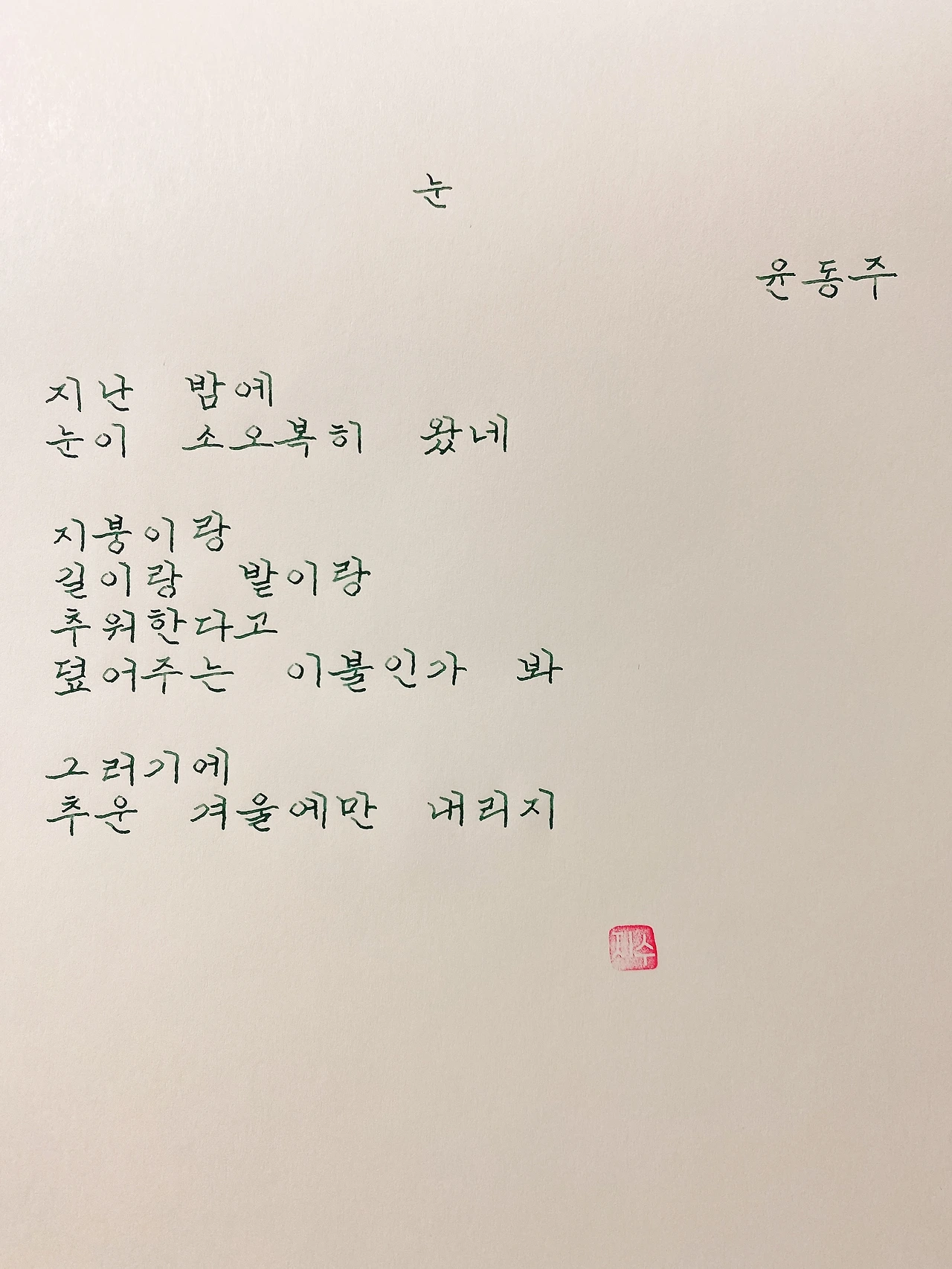 평범한 직장인. 사내 동호회를 통해 매일 한편 손으로 시 읽기를 시작한 이후로, 매일 시 한편을 필사 합니다. 필사한 시가 저작권에 문제가 된다면 말씀해주세요.