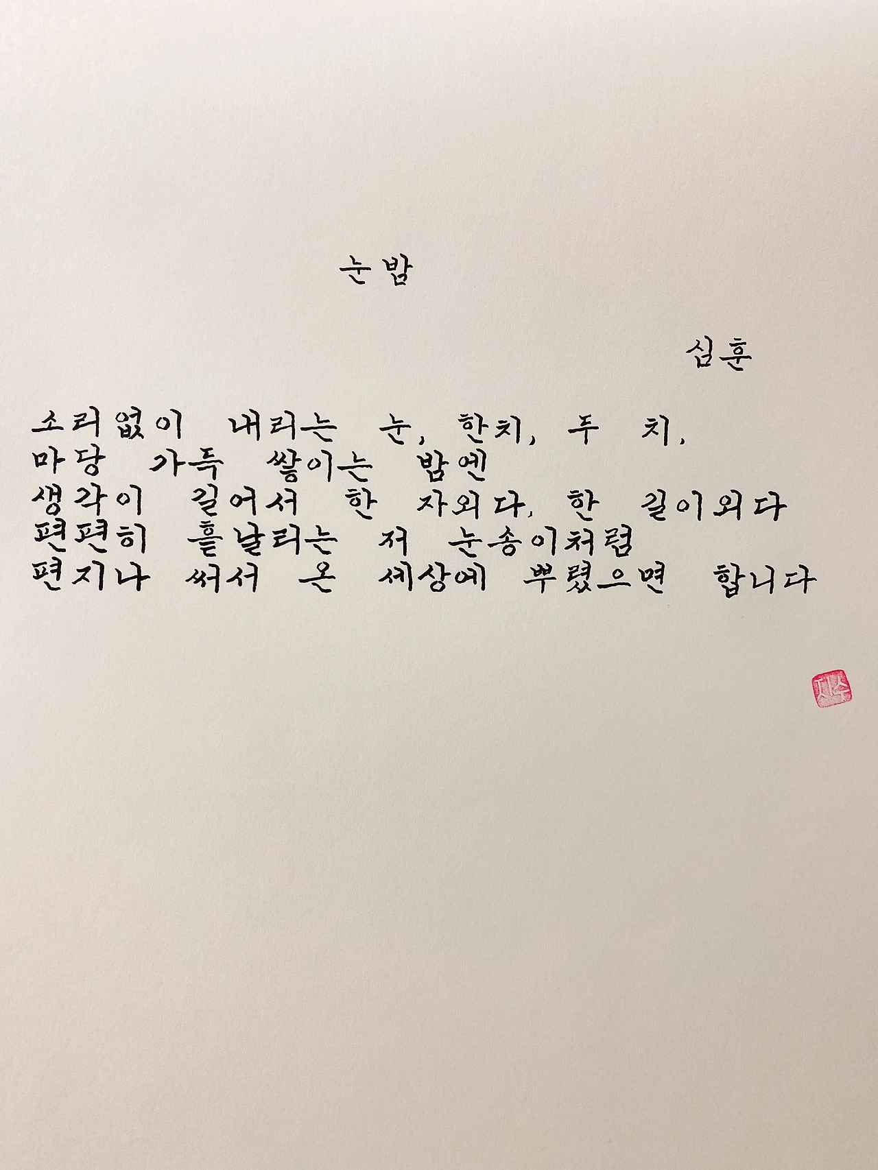 평범한 직장인. 사내 동호회를 통해 매일 한편 손으로 시 읽기를 시작한 이후로, 매일 시 한편을 필사 합니다. 필사한 시가 저작권에 문제가 된다면 말씀해주세요.