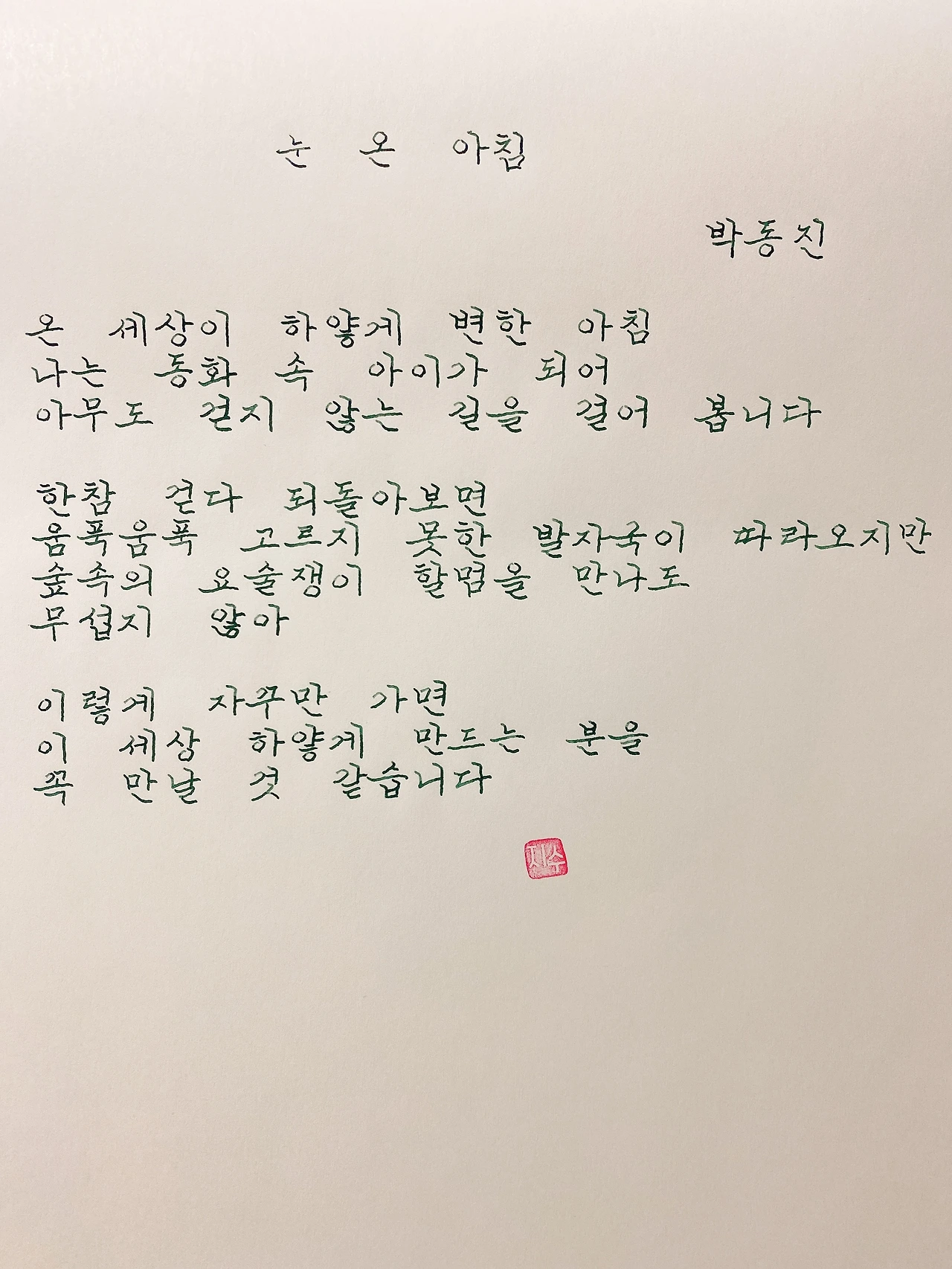 평범한 직장인. 사내 동호회를 통해 매일 한편 손으로 시 읽기를 시작한 이후로, 매일 시 한편을 필사 합니다. 필사한 시가 저작권에 문제가 된다면 말씀해주세요.