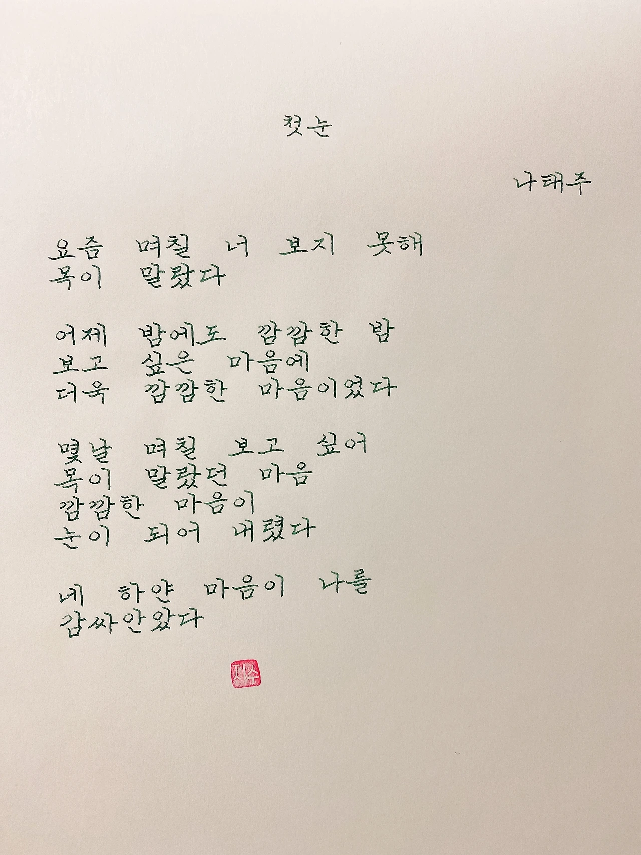 평범한 직장인. 사내 동호회를 통해 매일 한편 손으로 시 읽기를 시작한 이후로, 매일 시 한편을 필사 합니다. 필사한 시가 저작권에 문제가 된다면 말씀해주세요.