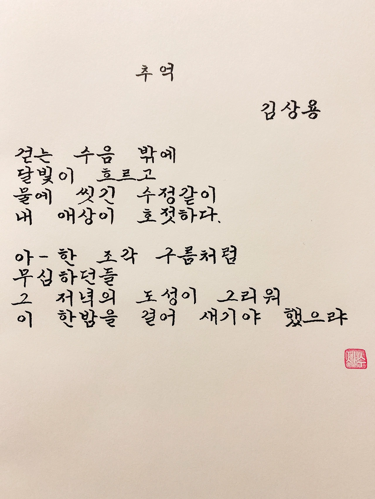 평범한 직장인. 사내 동호회를 통해 매일 한편 손으로 시 읽기를 시작한 이후로, 매일 시 한편을 필사 합니다. 필사한 시가 저작권에 문제가 된다면 말씀해주세요.