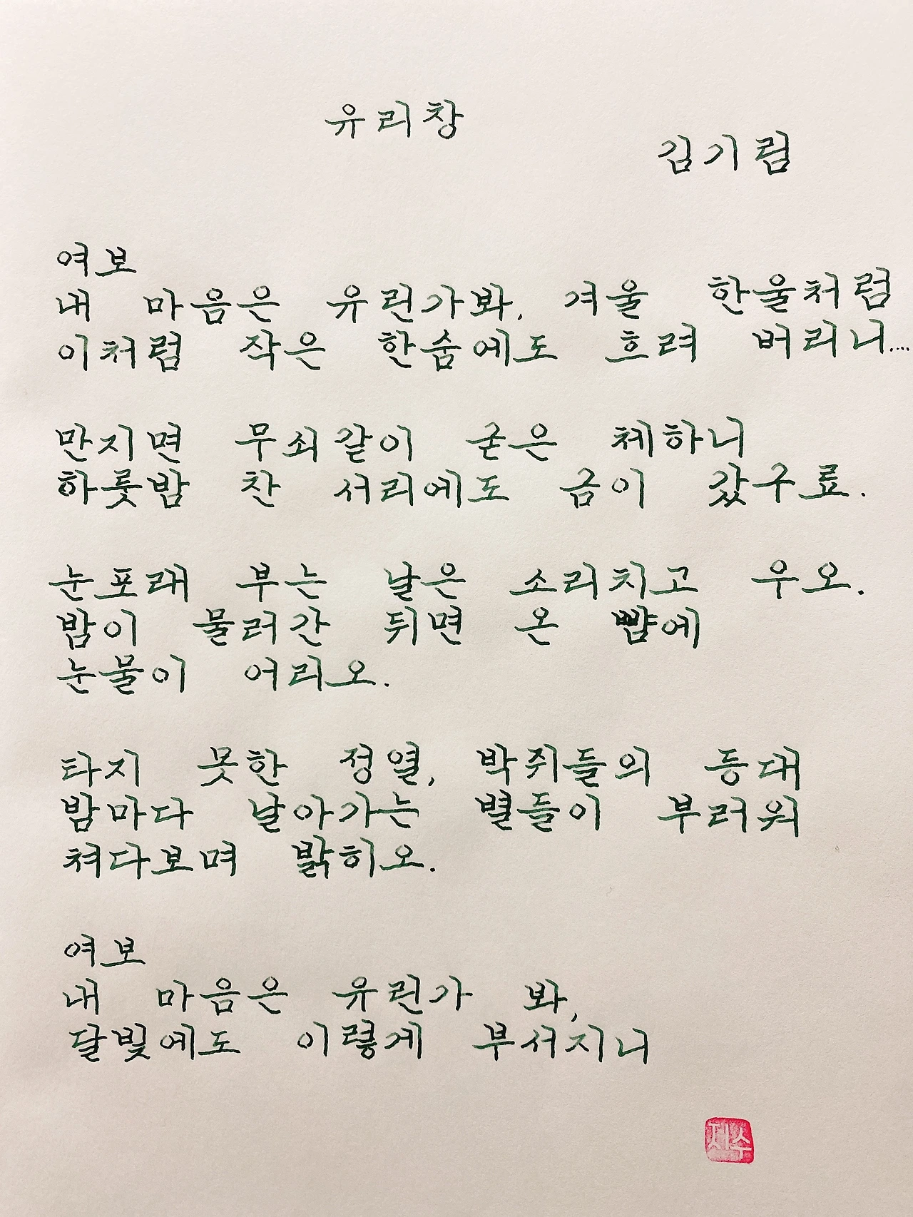 평범한 직장인. 사내 동호회를 통해 매일 한편 손으로 시 읽기를 시작한 이후로, 매일 시 한편을 필사 합니다. 필사한 시가 저작권에 문제가 된다면 말씀해주세요.