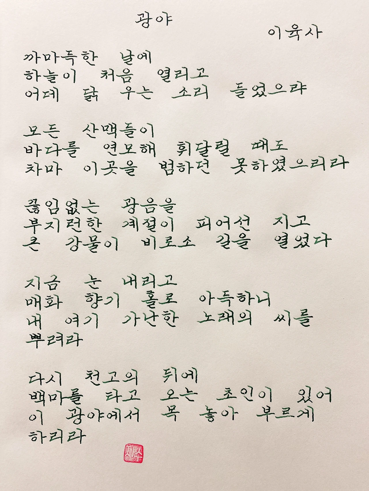 평범한 직장인. 사내 동호회를 통해 매일 한편 손으로 시 읽기를 시작한 이후로, 매일 시 한편을 필사 합니다. 필사한 시가 저작권에 문제가 된다면 말씀해주세요.