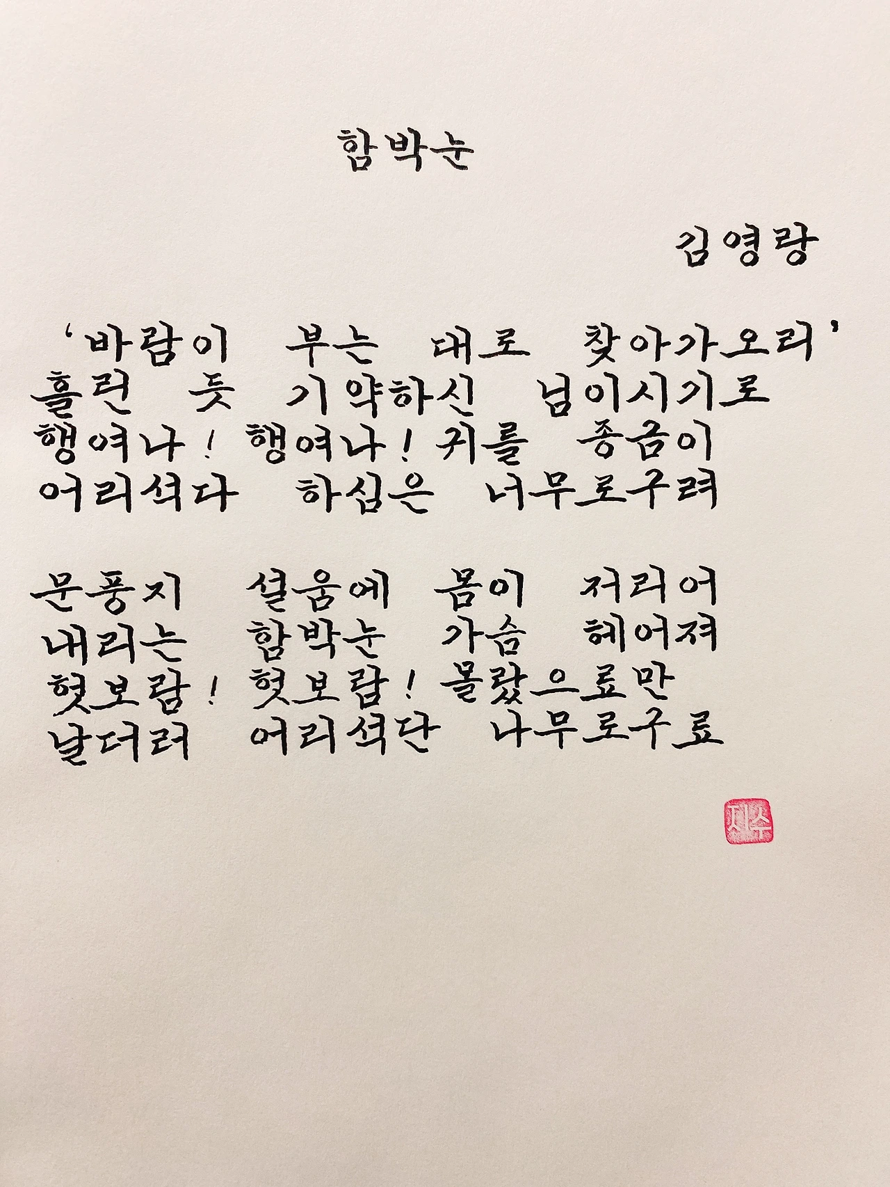 평범한 직장인. 사내 동호회를 통해 매일 한편 손으로 시 읽기를 시작한 이후로, 매일 시 한편을 필사 합니다. 필사한 시가 저작권에 문제가 된다면 말씀해주세요.