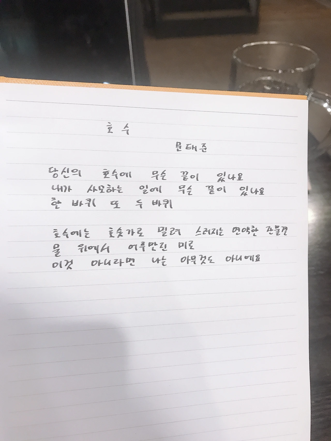 [0311] 호수 by 문태준 당신의 호수에 무슨 끝이 있나요내가 사모하는 일에 무슨 끝이 있나요한 바퀴 또 두 바퀴 호수에는 호숫가로 밀려 스러지는 연약한 잔물결물 위에서 어루만진 미로이것 아니라면 나는 아무것도 아니에요