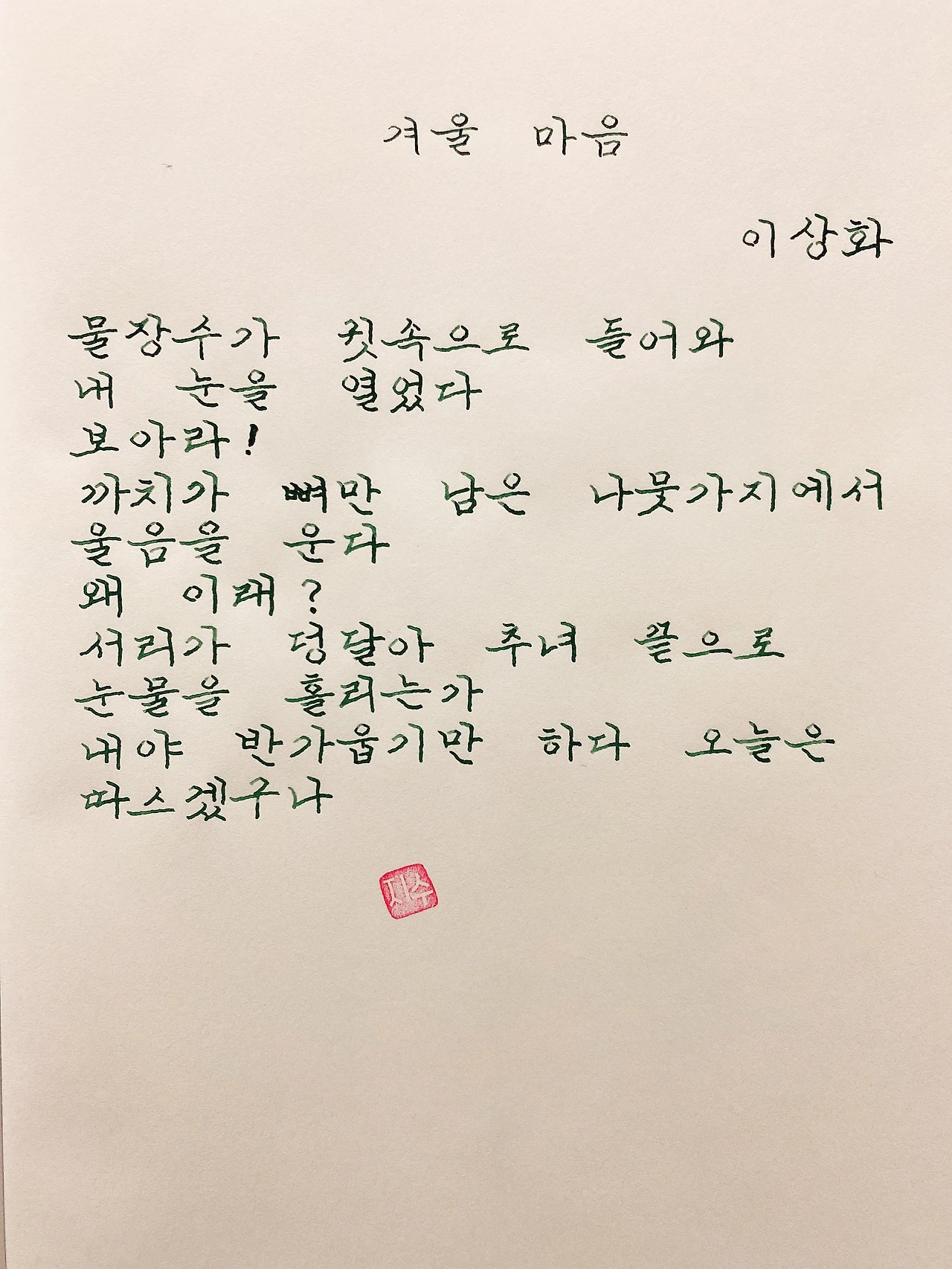 평범한 직장인. 사내 동호회를 통해 매일 한편 손으로 시 읽기를 시작한 이후로, 매일 시 한편을 필사 합니다. 필사한 시가 저작권에 문제가 된다면 말씀해주세요.