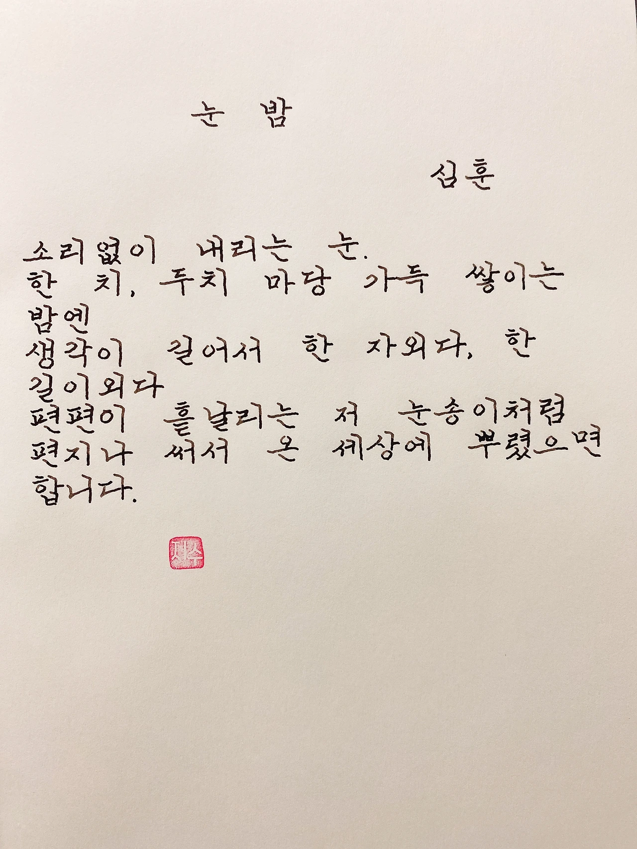 평범한 직장인. 사내 동호회를 통해 매일 한편 손으로 시 읽기를 시작한 이후로, 매일 시 한편을 필사 합니다. 필사한 시가 저작권에 문제가 된다면 말씀해주세요.