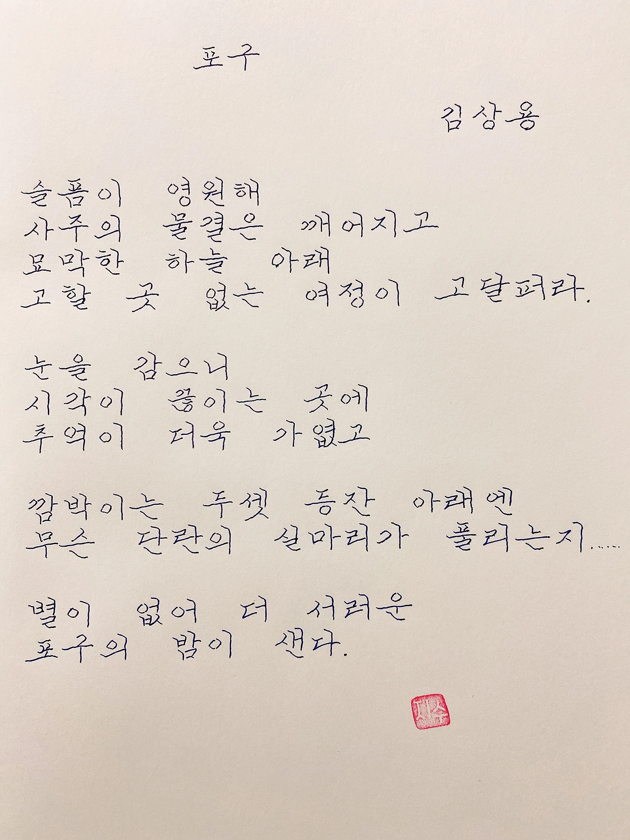 평범한 직장인. 사내 동호회를 통해 매일 한편 손으로 시 읽기를 시작한 이후로, 매일 시 한편을 필사 합니다. 필사한 시가 저작권에 문제가 된다면 말씀해주세요.