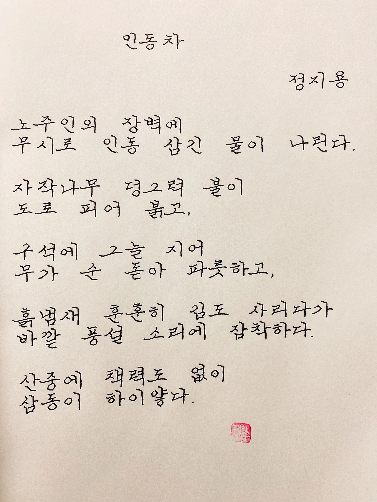 평범한 직장인. 사내 동호회를 통해 매일 한편 손으로 시 읽기를 시작한 이후로, 매일 시 한편을 필사 합니다. 필사한 시가 저작권에 문제가 된다면 말씀해주세요.