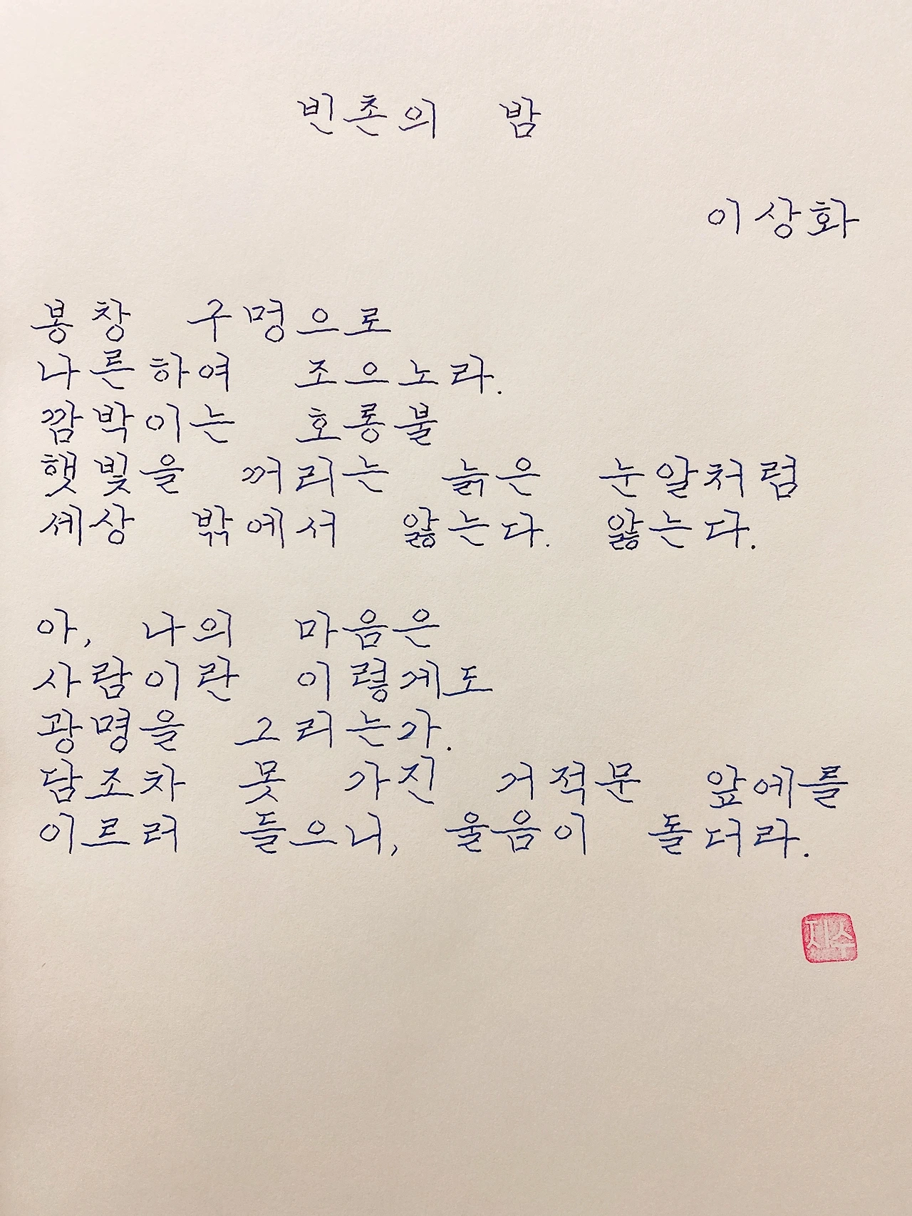 평범한 직장인. 사내 동호회를 통해 매일 한편 손으로 시 읽기를 시작한 이후로, 매일 시 한편을 필사 합니다. 필사한 시가 저작권에 문제가 된다면 말씀해주세요.