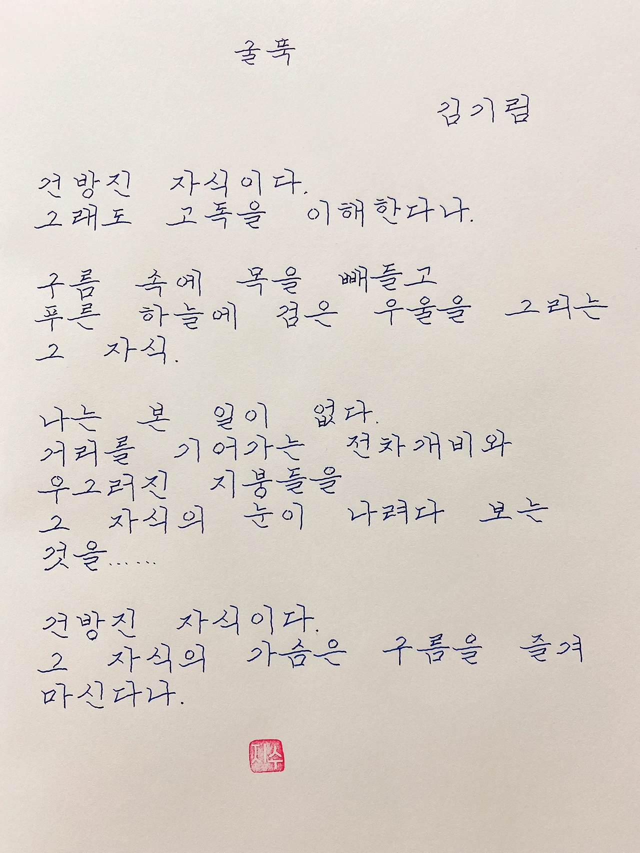 평범한 직장인. 사내 동호회를 통해 매일 한편 손으로 시 읽기를 시작한 이후로, 매일 시 한편을 필사 합니다. 필사한 시가 저작권에 문제가 된다면 말씀해주세요.