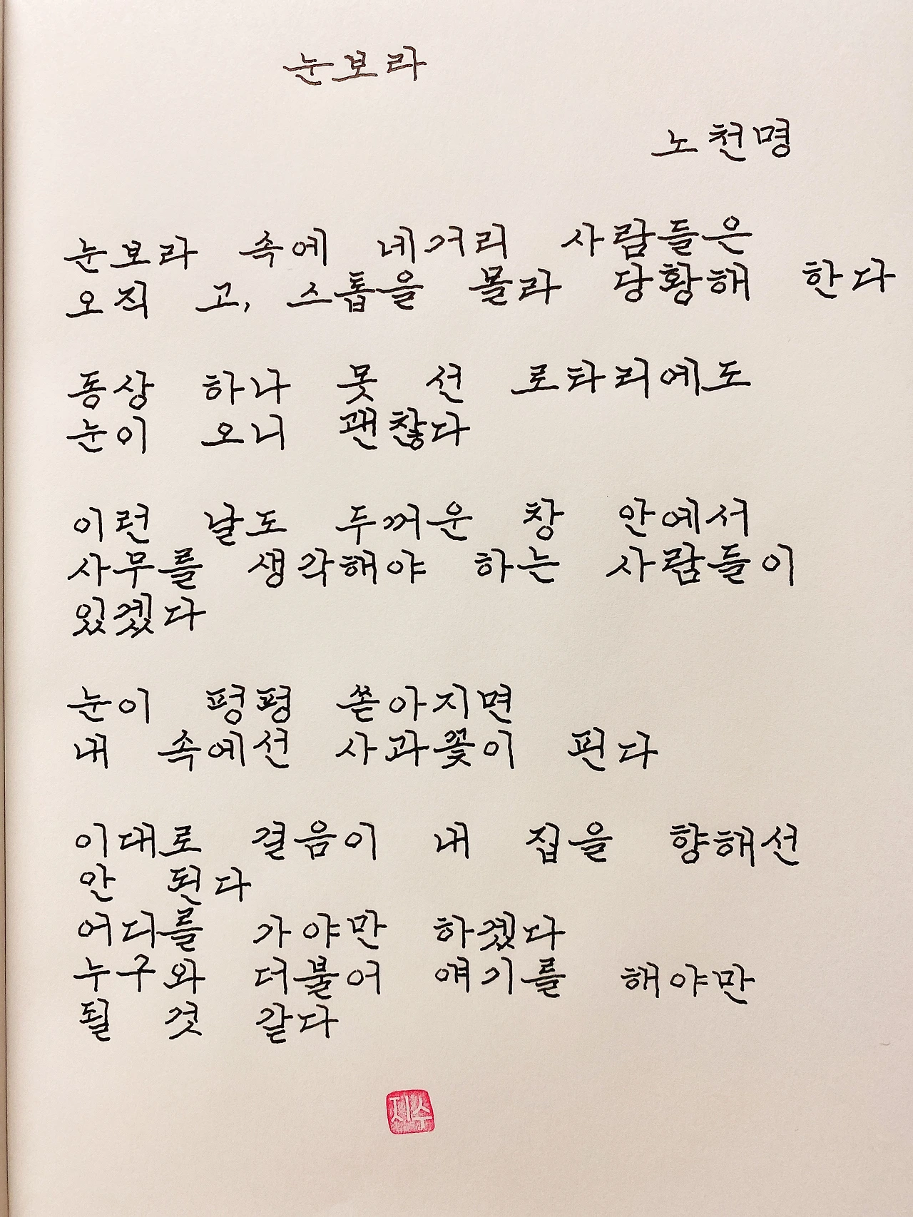 평범한 직장인. 사내 동호회를 통해 매일 한편 손으로 시 읽기를 시작한 이후로, 매일 시 한편을 필사 합니다. 필사한 시가 저작권에 문제가 된다면 말씀해주세요.