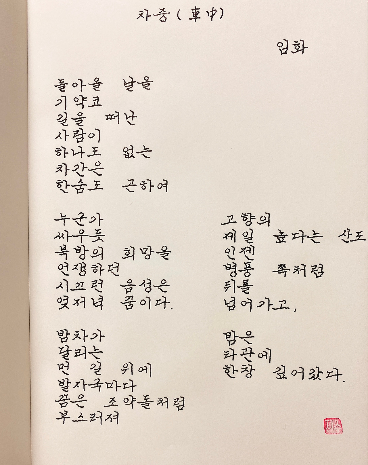 평범한 직장인. 사내 동호회를 통해 매일 한편 손으로 시 읽기를 시작한 이후로, 매일 시 한편을 필사 합니다. 필사한 시가 저작권에 문제가 된다면 말씀해주세요.